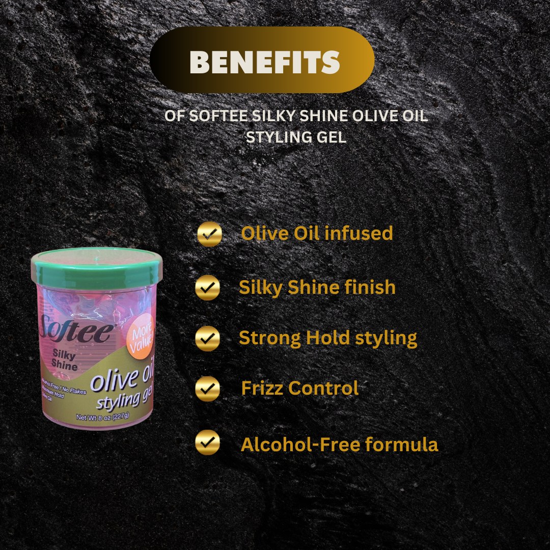 Enhance your hair's shine and manageability with Softee Silky Shine Olive Oil Styling Gel. Made with nourishing olive oil, this lightweight gel provides long-lasting hold and leaves your hair silky and smooth. Say goodbye to frizz and hello to a beautiful, polished look.