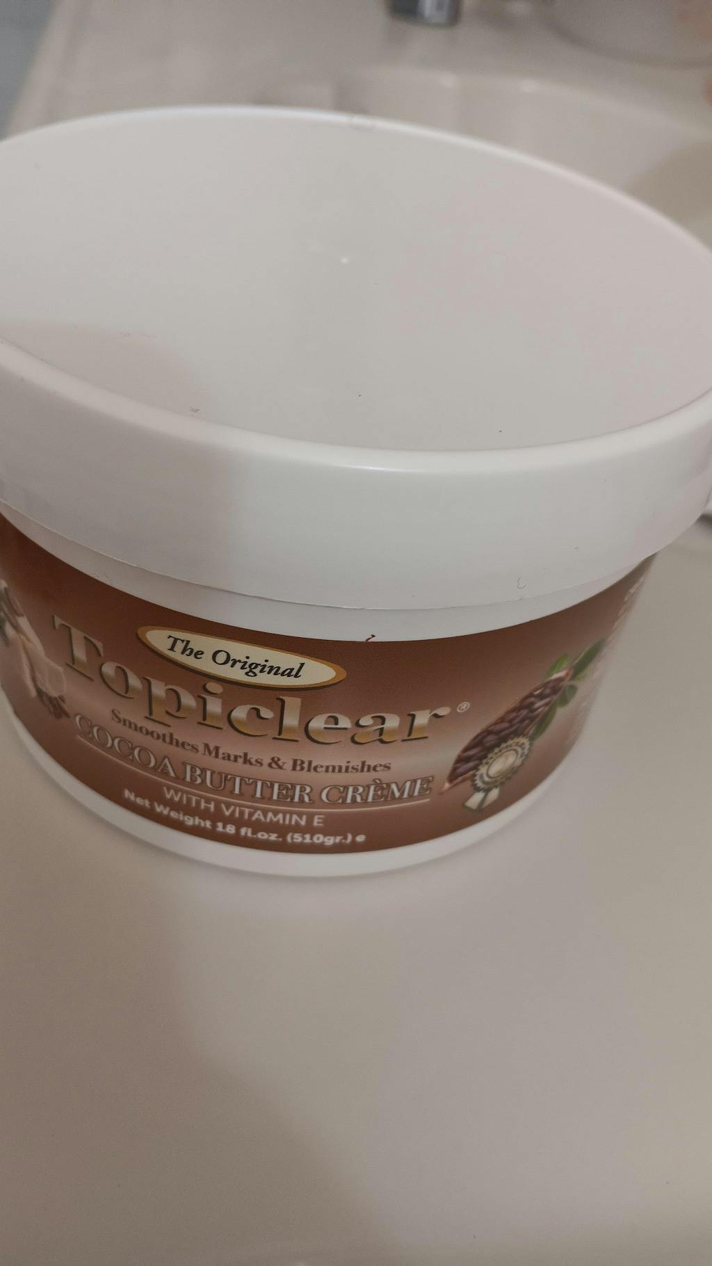 Topiclear Cocoa Butter Creme 18 oz Topiclear Cocoa Butter Creme smoothes marks & blemishes. Topiclear Cocoa Butter is fortified with a special blend of Vitamin A & E and enriched with the essential fatty acid, GLA found in Evening Primrose Oil to soften and moisturize rough, dry skin. It also helps smooth stretch marks, scars and blemishes. and improves the skin's overall appearance through revitalized skin tone and complexion.