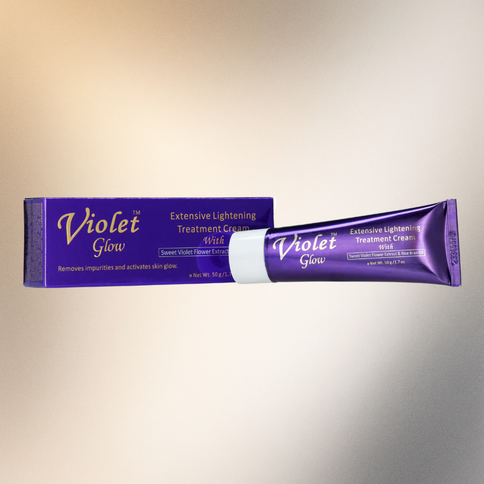 Violet Glow Extensive Cream 1.7 oz With Sweet Violet Flower Extract & Rice Bran Oil Violet Glow Cream is formulated with Sweet Violet Flower Extract which is a medicinal flower and herb that has been used for thousands of years for its healing properties. It is rich with Vitamins A & C and is packed with bioflavonoids to protest your skin against elements. And with Rice Bran Oil which contains significant levels of alpha, beta, gamma & delta tocotrienol, it produces smooth, healthy skin and acts as a natural agent. It helps resolve all hyper pigmentation problems of the skin such as: scars, pregnancy and acne marks, age spots and sun patches.