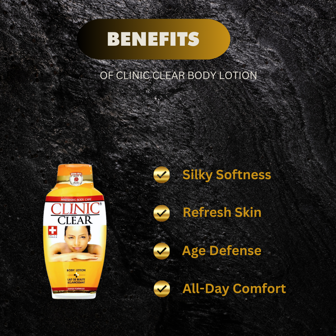 Discover the beauty secret of African-American women with Clinic Clear Body Lotion 500ml! This multi-function body care is the perfect solution for perfecting and hydrating your skin in one step. Its special formula has been designed to meet the needs of African skins and enhance their natural beauty. Enjoy a unified, radiant complexion with protection against premature signs of aging with this advanced body lotion from Dodo Cosmetics, Togo. Enjoy a perfect complexion today with Clinic Clear Body Lotion 500ml!