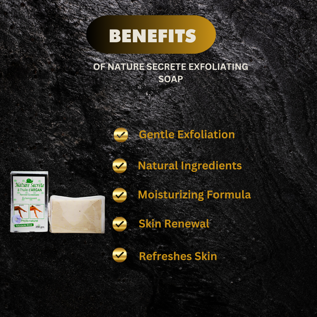 Nature Secrete Exfoliating Soap 11.6 oz Nature Secrete With Pure Argan Oil Soap Exfoliating Soap, Nature Secret With The Argan Oil Accelerates The Removal Of Dead Cells From Your Skin, Corrects Imperfections Of Your Face And Neck Thus Erase Fine Lines And Wrinkles In Deep Cleaning Your Skin, This Soap is an excellent for Anti-Age, It leaves your skin smooth, bright And without blemishes or pimples.