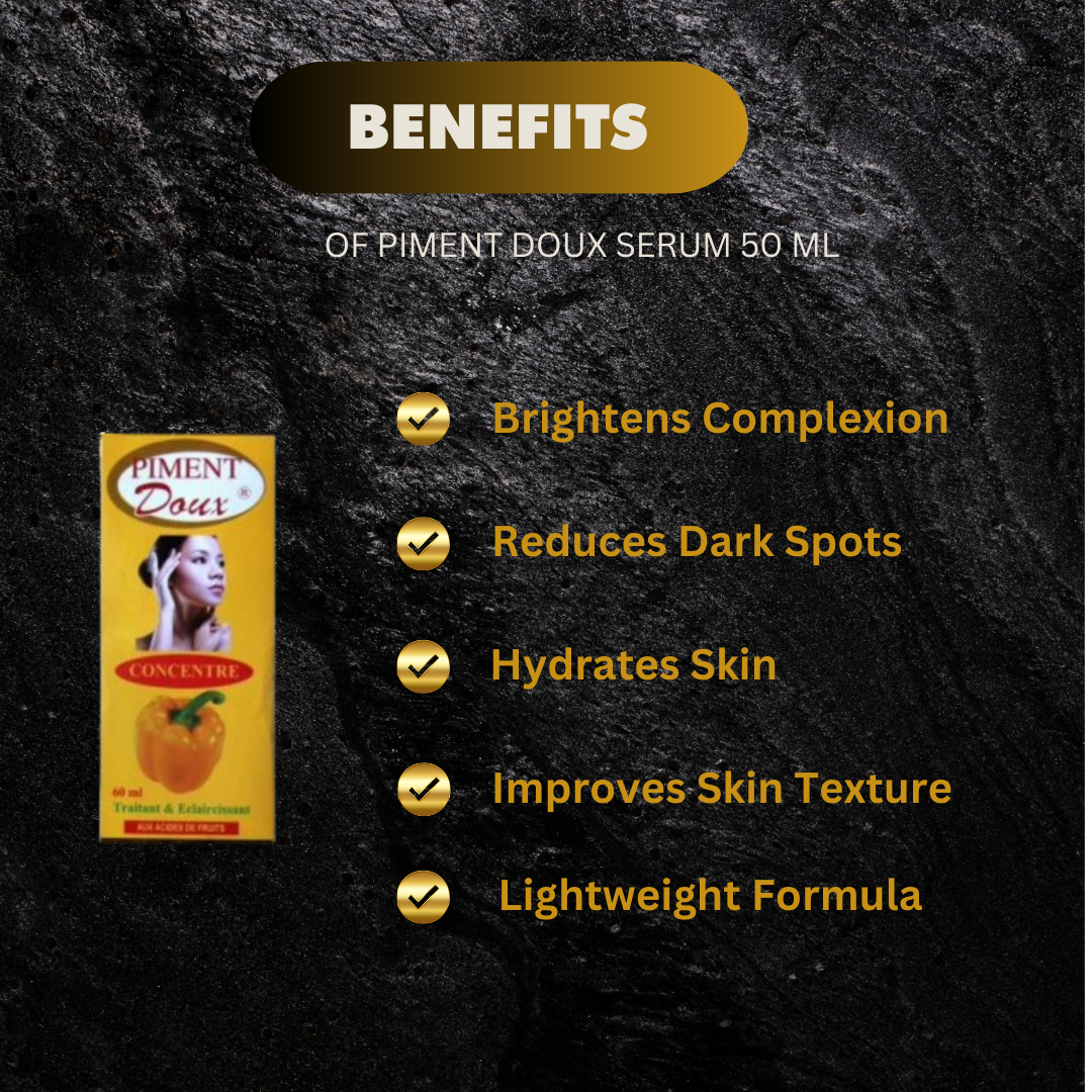 - Piment Doux Serum is a powerful serum designed to even out skin tone and reduce the appearance of dark spots.