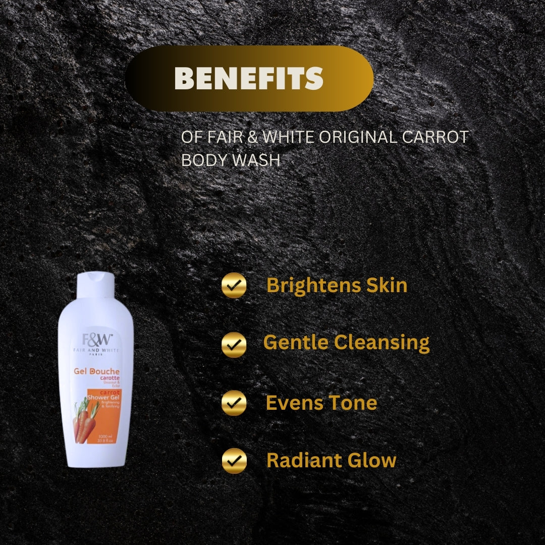 - Fair & White Original Carrot Body Wash is a nourishing body wash that helps to brighten and even out skin tone.