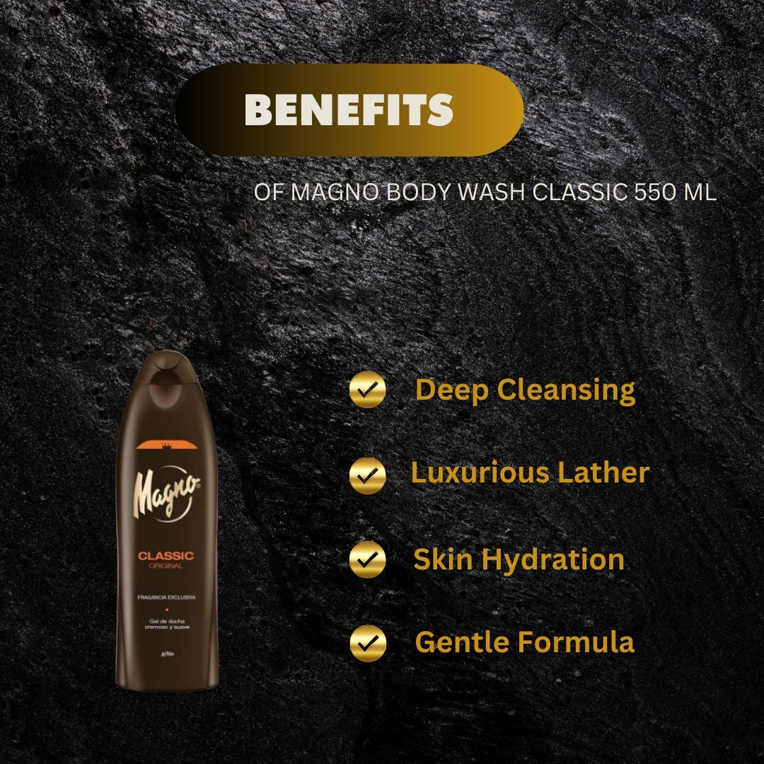 - Magno Body Wash Classic is a luxurious shower gel that provides a deep cleansing experience.