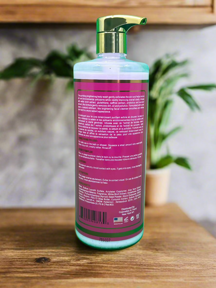 This purifying clarifying body wash gently exfoliates the skin and helps remove dirt and environmental pollutants while visibly improving overall clarity. Infused with white birch extract, glutathione, saffron extract, probiotics, and curcumin extract, this formula gently removes dirt, oil, and pollution. Formulated with carrot seed, a natural exfoliant, this clarifying facial cleanser smoothes and refines skin feel for a more radiant appearance.