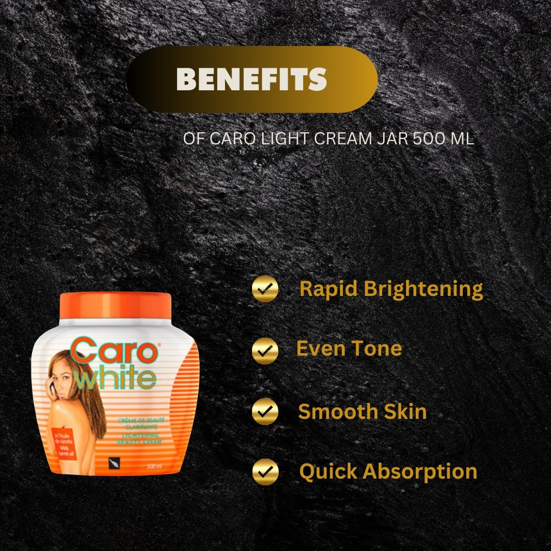 Caro Light Beauty Cream is a luxurious and lightweight cream that provides an intense hydrating and nourishing experience for your skin. Its unique blend of B-carotone and vitamins A and E helps to brighten and soften your skin, while protecting it against environmental damage. With consistent use, you'll enjoy a luminous, satin-smooth complexion that radiates health and vitality. This nourishing cream is perfect for all skin types, and its light texture won't leave behind any heavy or greasy residue. Give your skin the pampering it deserves with Caro Light Beauty Cream!