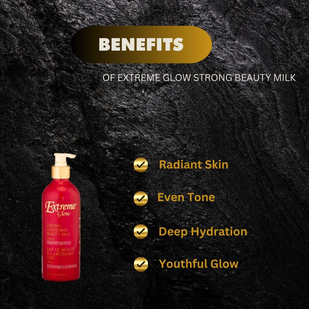 Experience the ultimate in nourishing skincare with Extreme Glow Strong Beauty Milk. Formulated with 16.9 oz of hydrating agents, this nourishing milk leaves your skin supple, radiant, and glowing. Powerful ingredients restore your skin's natural moisture balance, leaving it feeling soft and looking fresh. Used daily to replace lost moisture and boost skin with nutrients, you can experience the beautiful glow you deserve.