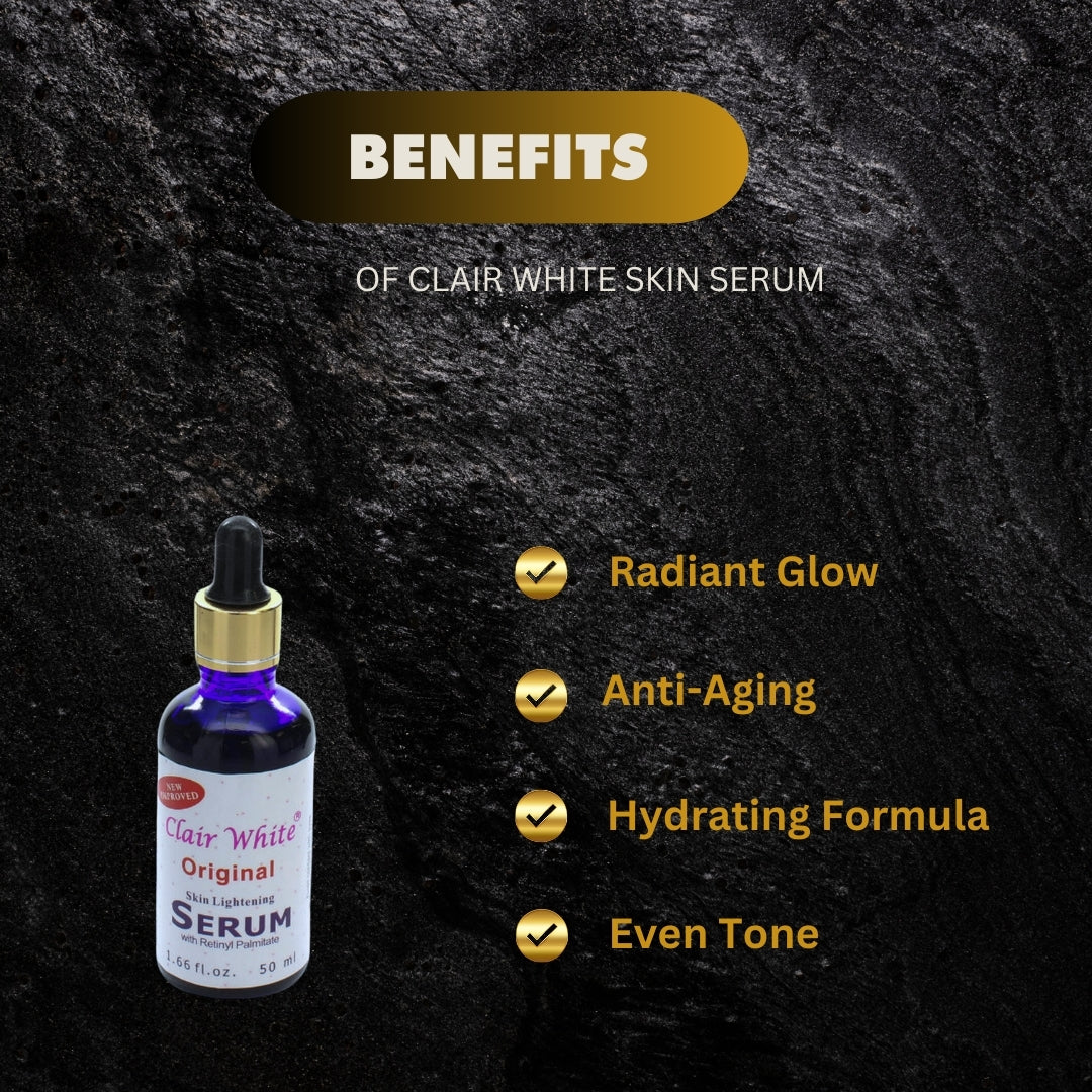 Clair & White Skin Serum is an intensive, oil-free formula designed to lighten and brighten the complexion. It contains a high concentration of active ingredients to prevent and reduce dark spots, giving the skin a more radiant and luminous look. The lightweight serum absorbs quickly into the skin without leaving a greasy residue, making it easy to apply and suitable for all skin types. It's the perfect solution for anyone looking to achieve brighter, clearer skin.