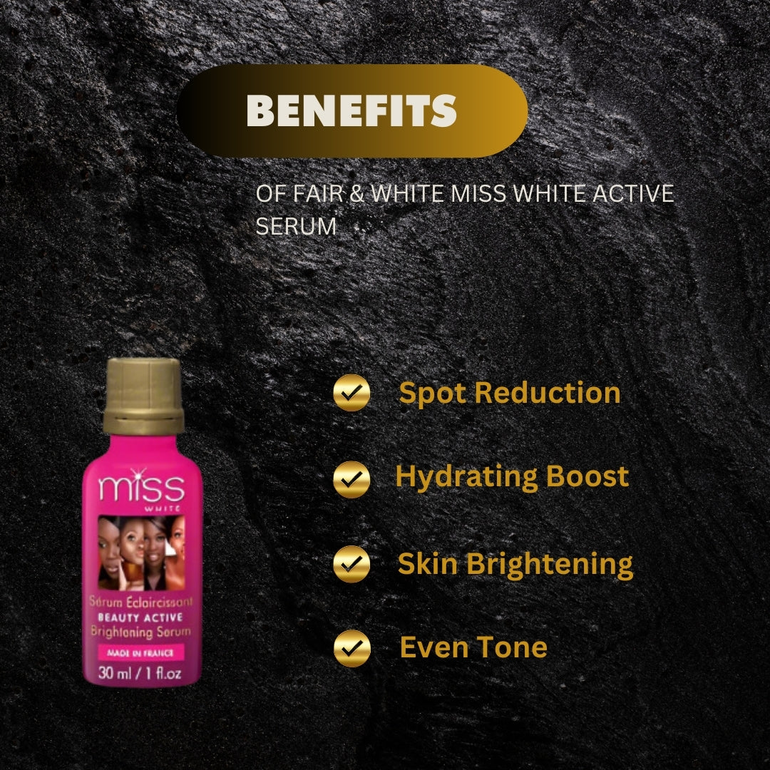Fair & White Miss White Active Serum FULL DESCRIPTION Description; Infused with a unique blend properties this lightweight serum promotes luminous, silky and amazingly beautiful even toned skin. Directions; Apply to clean dry skin on areas of concern, preferably at night. Follow up with OUR SPF 50 Skin Protect sun protection every morning to prevent further skin discoloration. This lightweight serum is perfect for combination/oily skin types. Skin Type; normal/ oily skin Size 30ml/1oz