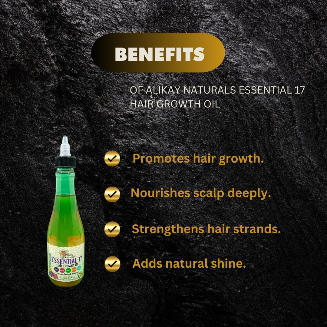 Essential 17 Hair Growth Oil by Alikay Naturals promotes hair growth with its unique blend of 17 essential oils. Its scientifically formulated ingredients nourish and strengthen hair, resulting in longer, healthier hair. Achieve your hair growth goals with this must-have hair oil.