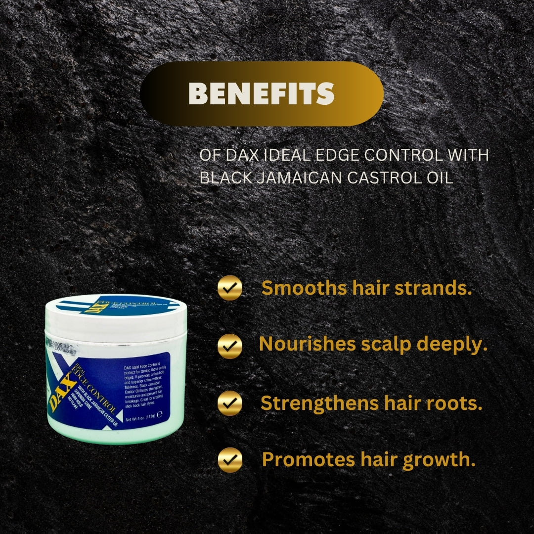 Achieve sleek and defined edges with Dax Ideal Edge Control. Formulated with Black Jamaican Castrol Oil, this 113g product provides a strong hold and nourishing benefits for all hair types. Say goodbye to frizz and hello to smooth, controlled edges.