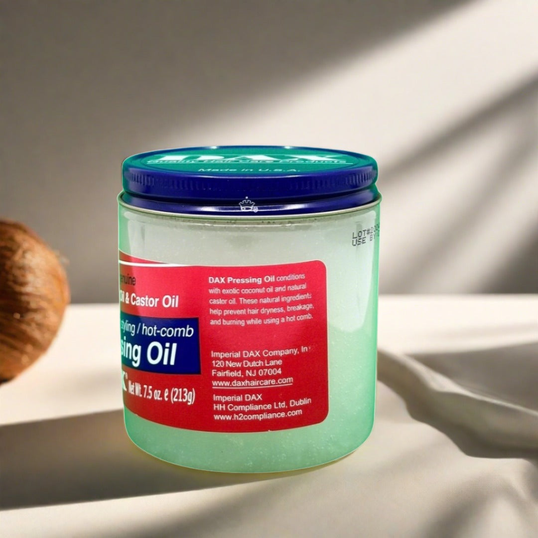 Expertly formulated with coconut and castor oil, Dax Pressing Oil nourishes and strengthens hair while providing a smooth, frizz-free finish. This versatile oil is perfect for all hair types and can be used for hot oil therapy, scalp massages, and everyday styling.