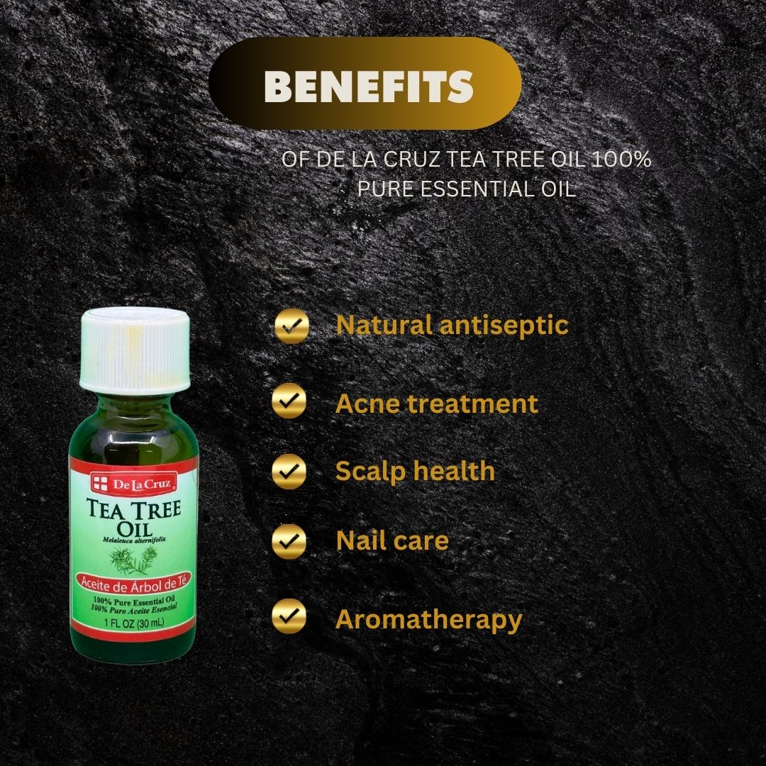 Discover the powerful benefits of De La Cruz Tea Tree Oil - 100% pure and essential. Stimulate your senses and improve your skin's appearance with this 30ml/1 fl.oz bottle, perfect for daily use. Experience the natural, therapeutic properties of Tea Tree Oil for yourself.