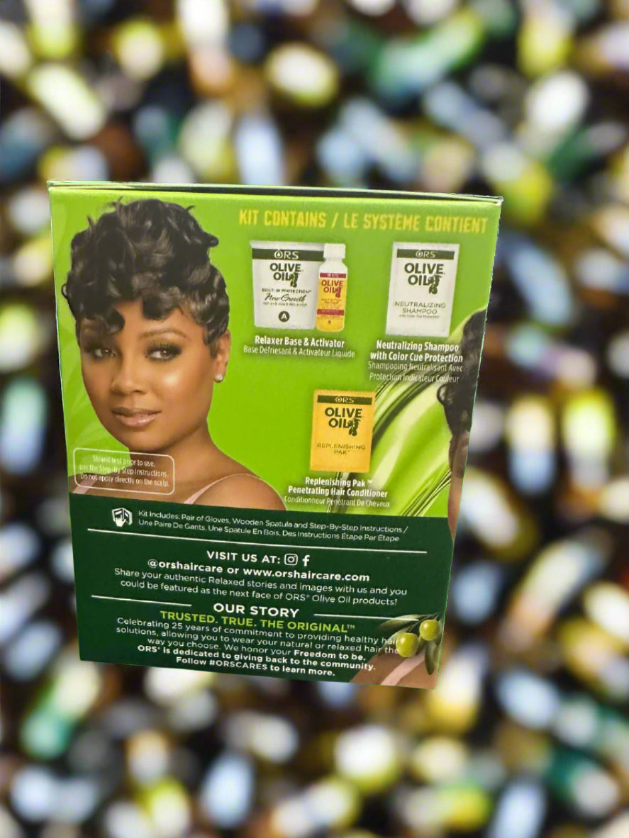 Organic Root Stimulator olive oil new growth Relaxer, normal protect your while you process it with the Olive oil new growth normal hair Relaxer from ORS. This kit offers built-in protection for new growth in a single application kit. Infused with all-natural olive oil, This No-Lye hair Relaxer Kit is just right for touch-ups and shorter hairstyles. Rich in fatty acids, The olive oil helps to moisturize your hair and add shine to the relaxer application.