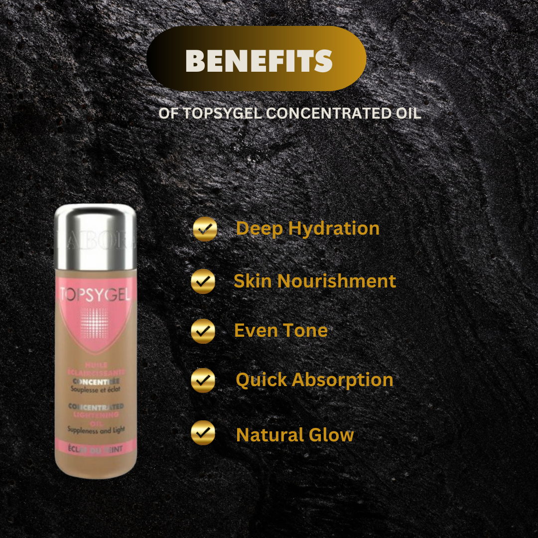 Topsygel Concentrated Oil 6 oz. TOPSYGEL OIL provides a dual softening and clarifying action. Its very soft formula is appropriate for all skin types. It moisturizes and repairs the most damaged skins. Its daily application reinforces the structure of your skin, thus protecting and clarifying your complexion, in a soft and homogeneous way.