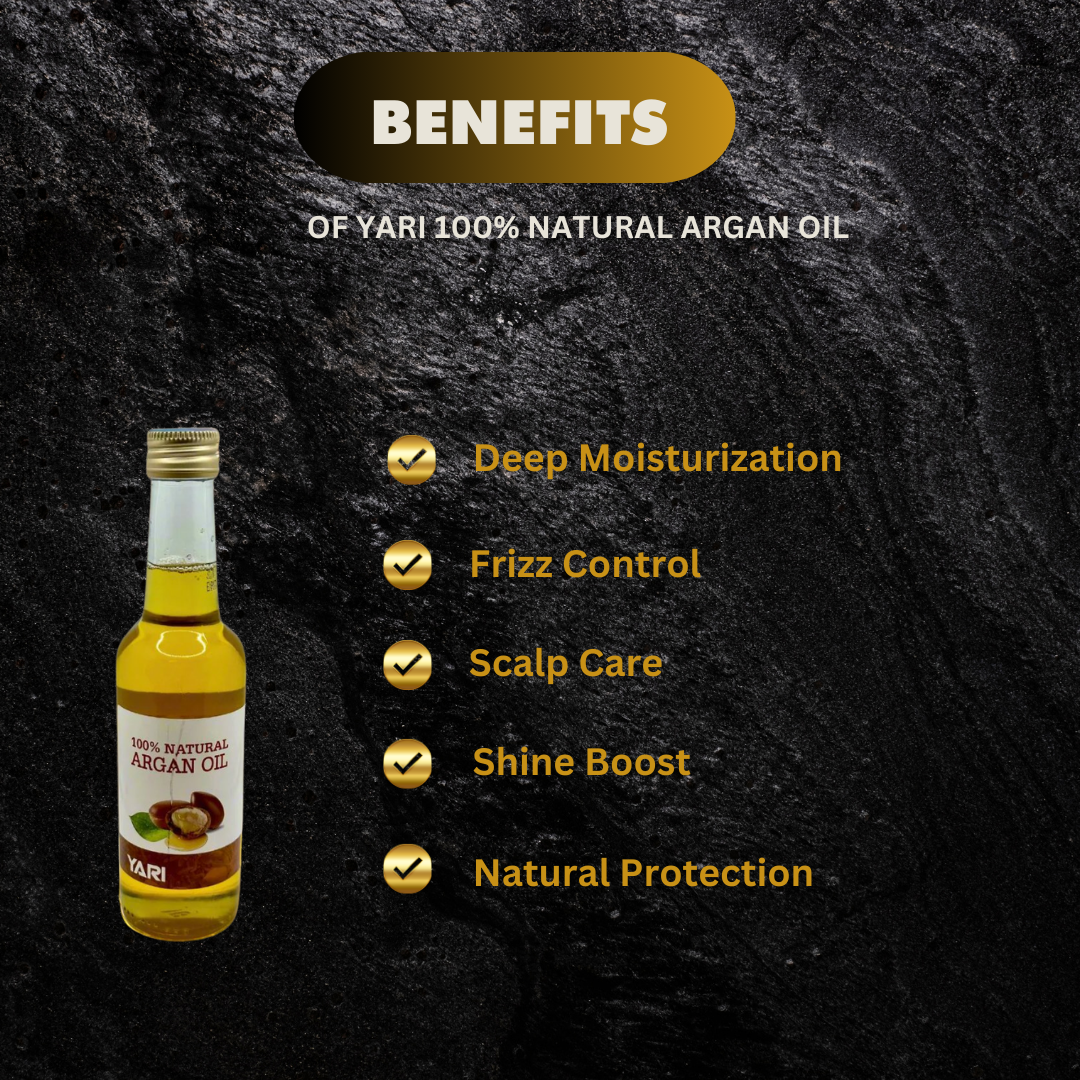 Yari 100% NATURAL Argan Oil is naturally rich in essential fatty acids, antioxidants, and vitamins. This pure oil helps nourish and hydrate hair and skin, improving texture and brightness. Enjoy its luxurious texture, premium quality, and reliable results!