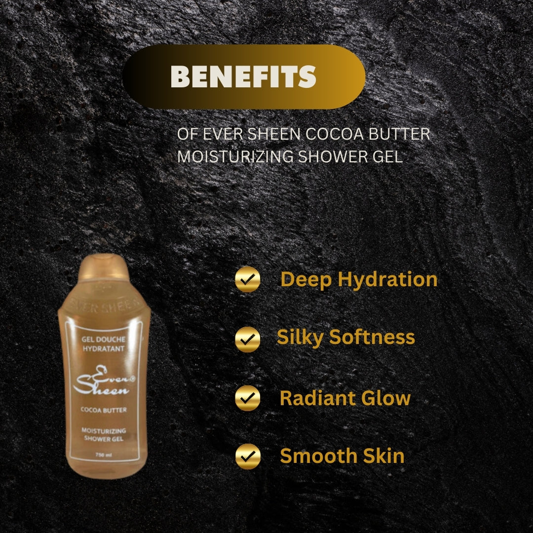 Ever Sheen Cocoa Butter Moisturizing Shower Gel 26.4 oz. The shower gel Ever Sheen offers you a naturally relaxing body wash and a true moment of pleasure. Enriched with pure cocoa butter and with a combination of moisturizing ingredients. It is ideal for delicate, sensitive and dry skins. Its creamy formula provides a sensation of softness and makes your skin delicately pleasant to touch.
