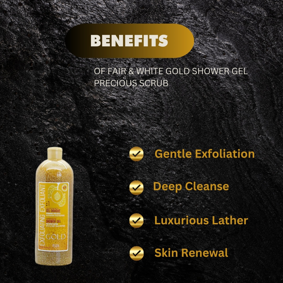- Fair & White Gold Shower Gel Precious Scrub helps to exfoliate and brighten the skin