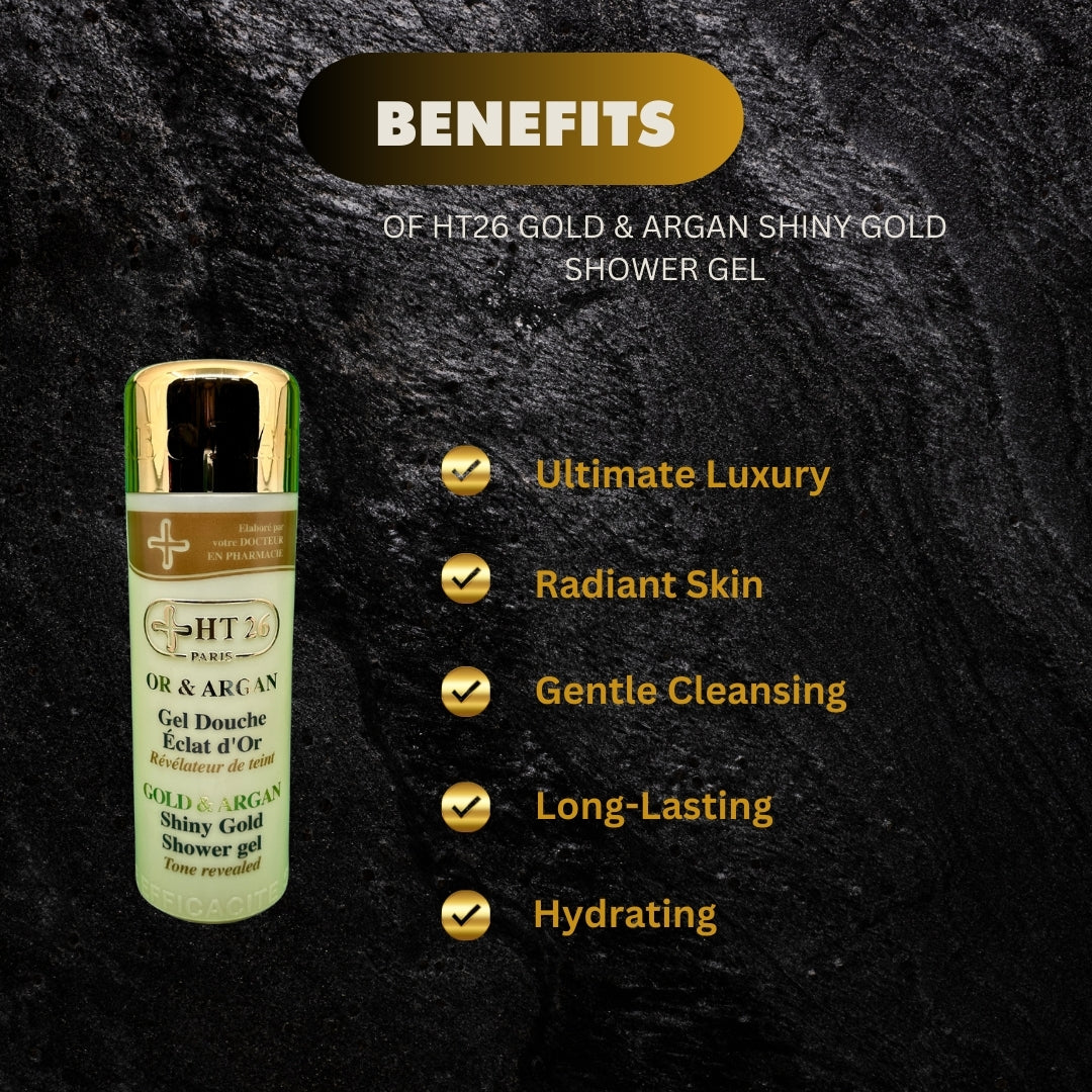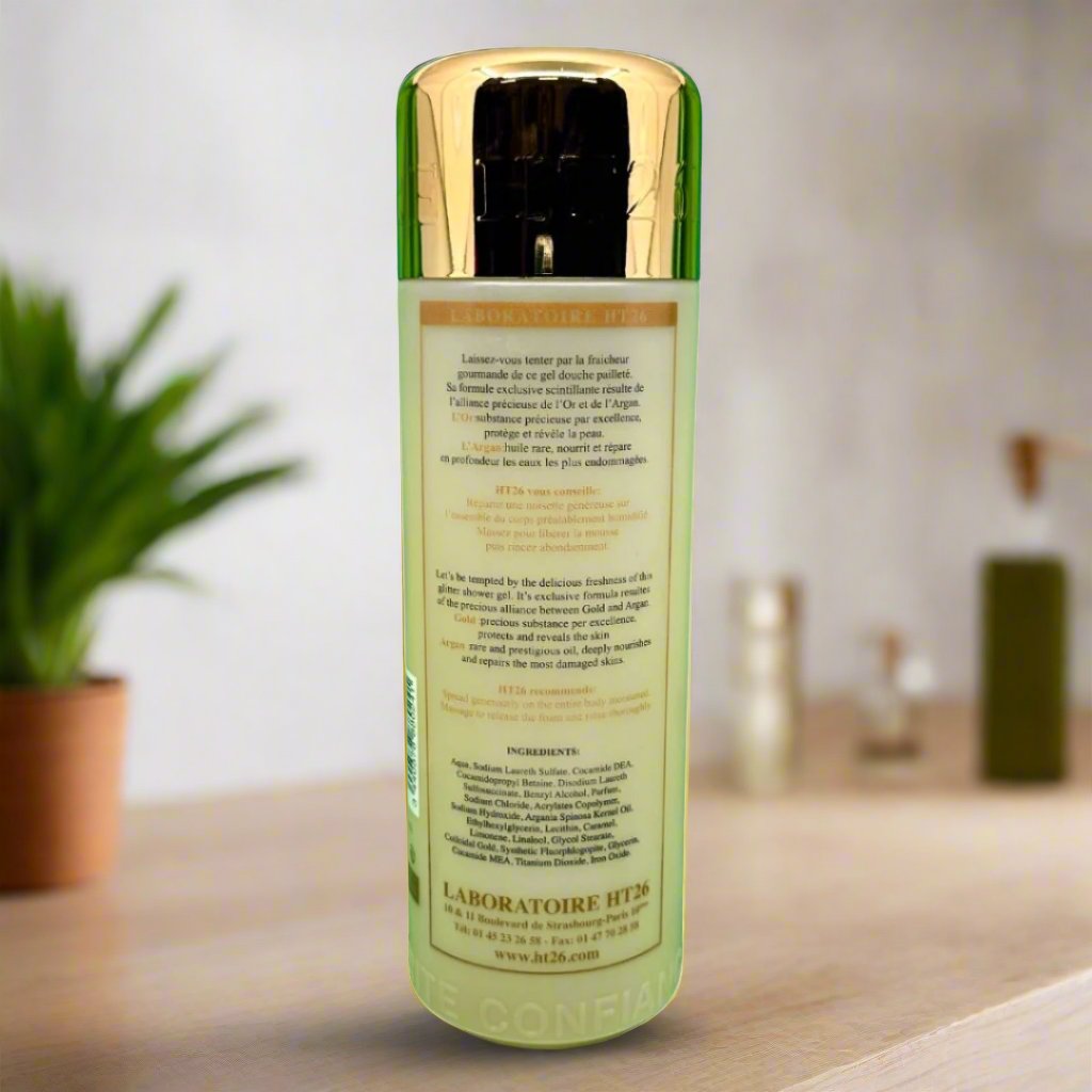 Experience ultimate luxury with HT26 Gold & Argan Shiny Gold Shower Gel. Infused with real gold and nourishing argan oil, this shower gel will leave your skin feeling soft, smooth, and radiant. Unleash the power of natural ingredients in this 1000ml bottle for a truly indulgent shower experience.