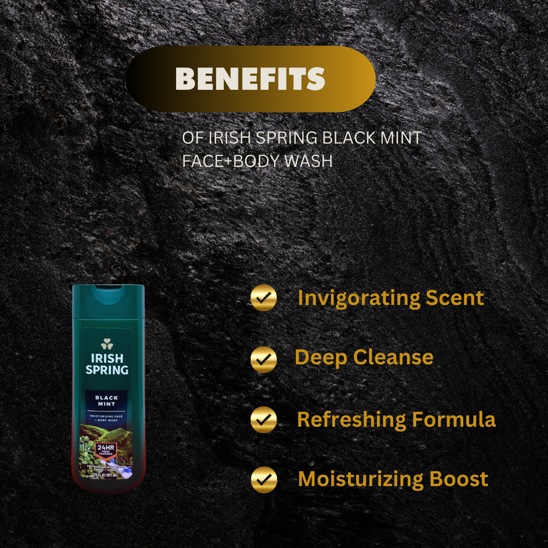 Experience the refreshing and invigorating clean of Irish Spring Black Mint Face+Body Wash. With its unique blend of peppermint and charcoal, this 591ml formula will leave your skin feeling revitalized and deeply cleansed. Elevate your daily hygiene routine and feel confident in your skin with this expertly crafted face and body wash.