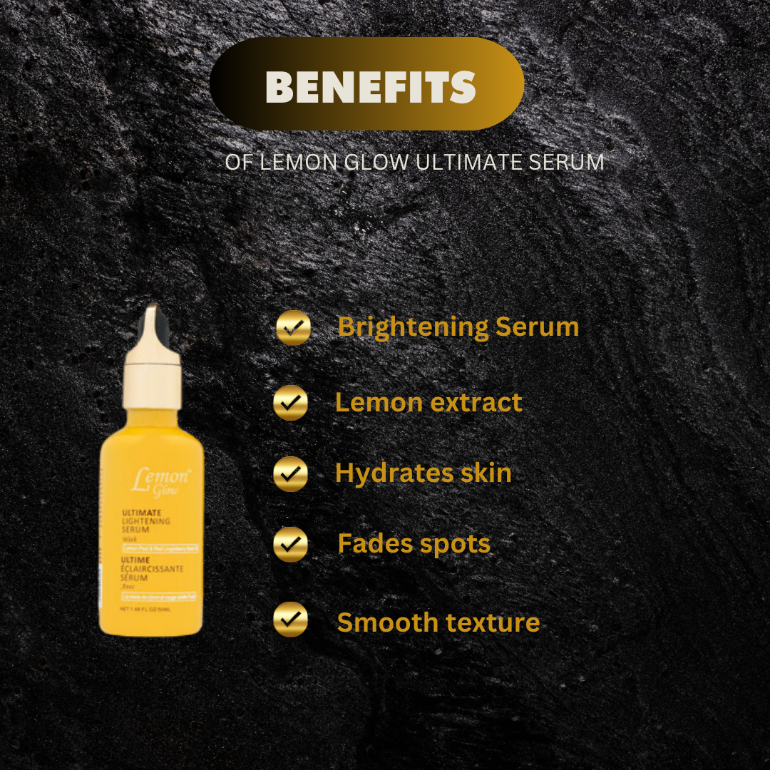 - Lemon Glow Ultimate Serum is a powerful skin serum that helps to even out skin tone and reduce the appearance of dark spots and blemishes.