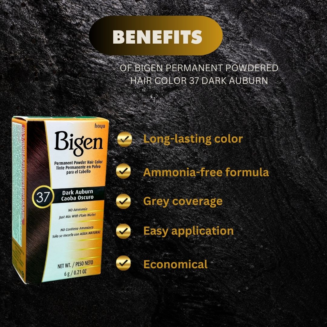 Enhance your hair color with Bigen Permanent Powdered Hair Color 37 Dark Auburn. With 6g of powder per package, you can achieve a rich, long-lasting color that covers gray and stays true to your natural hair tone. Experience professional quality hair dye at home with Bigen.