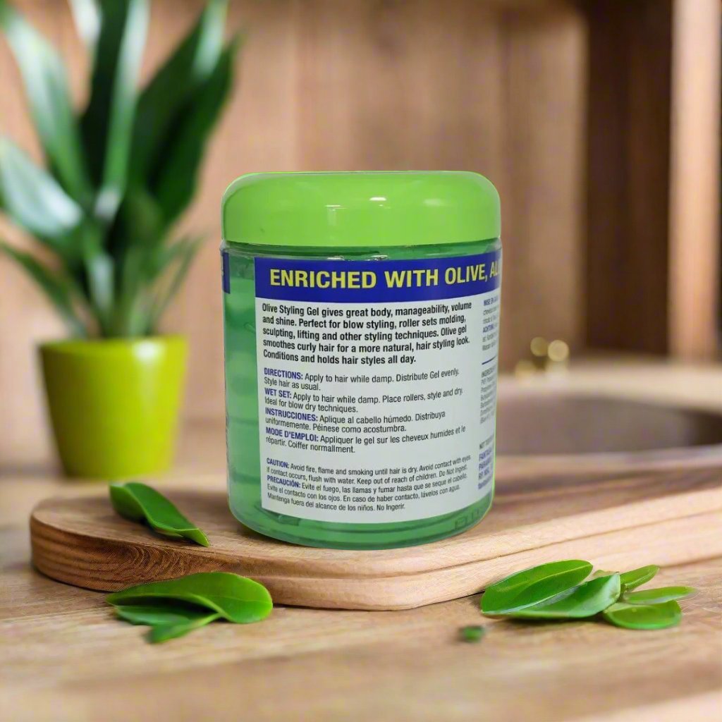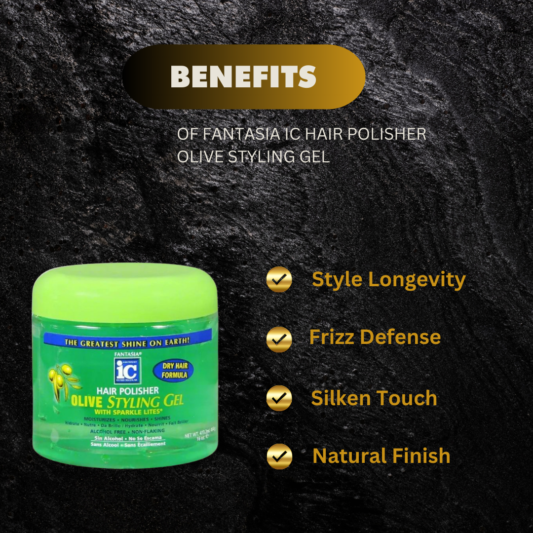 Fantasia Hair Polisher Olive Styling Gel 16 oz Olive styling gel gives great body, manageability, volume and shine. Moisturizes, Nourishes, shines. (Dry Hair Formula). Features: Humidity resistant/protective sunscreen. Perfect for blow styling, roller sets, molding, sculpting, lifting and other styling techniques. Olive gel smooths curly hair for a more natural, hair styling look. Defies gravity, condition and holds hair styles all day. Perfect for blow styling, roller sets, molding, sculpting, lifting and other techniques Smooths curly hair for a more natural look Alcohol free, non-flaking Not oily or greasy Enriched with olive, aloe, vitamins & silk protein.