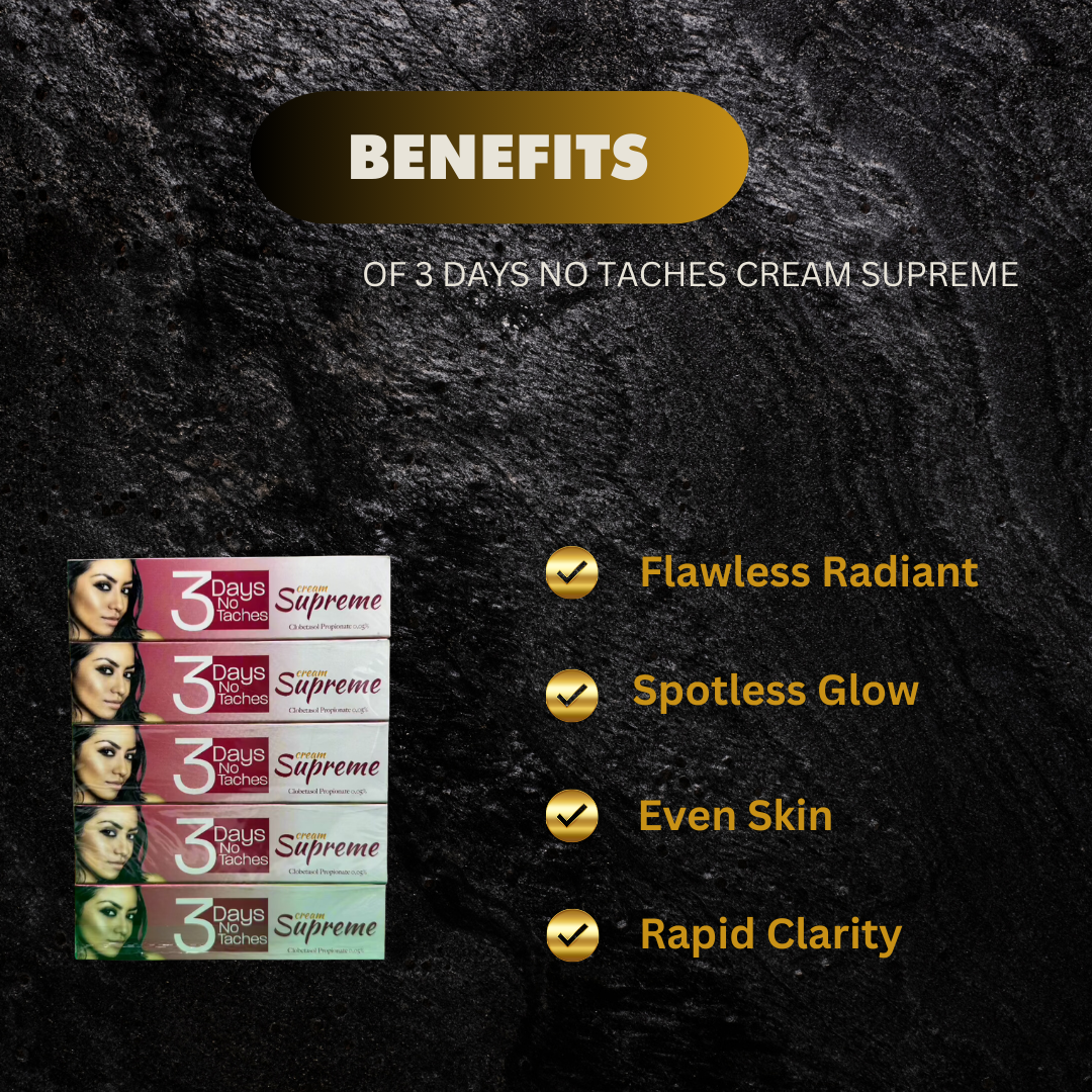 Introducing 3 Days No Taches Cream Supreme, the ultimate solution for skin discoloration. With its powerful formula, this 30g cream promises visible results in just 3 days. Say goodbye to dark spots and hello to a glowing complexion. Trust the experts and experience the difference.