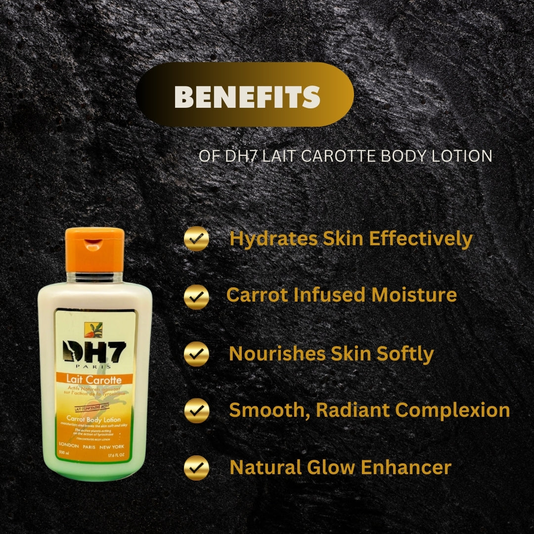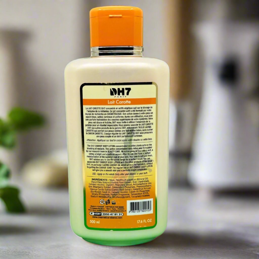 Experience hydrated and nourished skin with DH7 Lait Carotte Body Lotion. Infused with carrot extract and other natural ingredients, this lotion deeply moisturizes and brightens skin while promoting a healthy glow. Suitable for all skin types, this 500ml bottle will keep your skin soft, smooth, and radiant all day long.