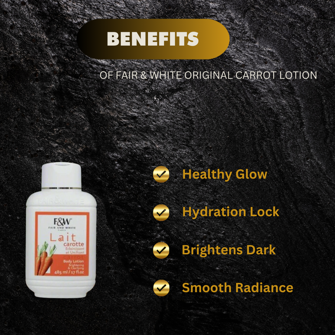 - Fair & White Original Carrot Lotion is a nourishing body lotion that helps to brighten and even out skin tone.