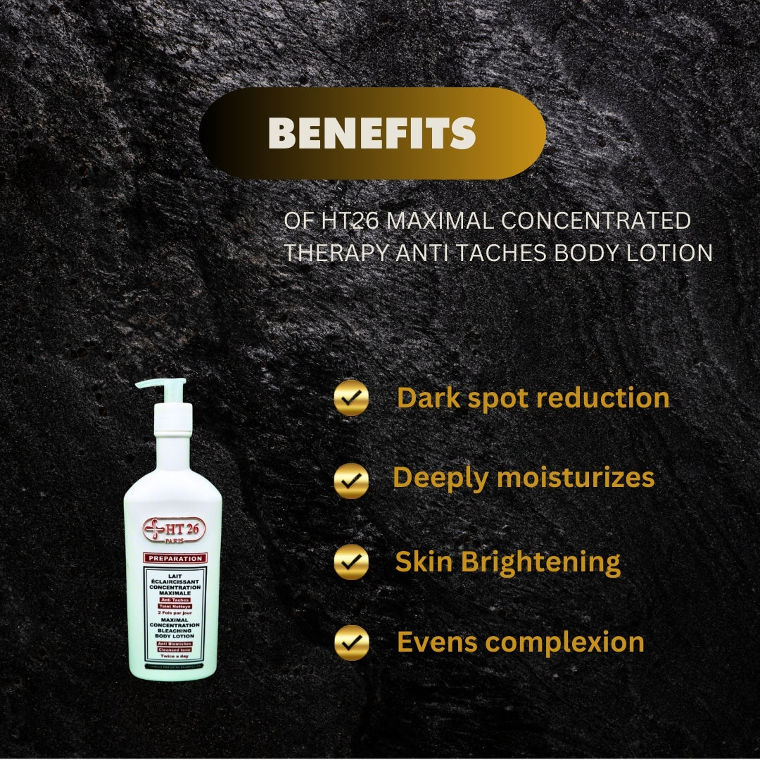 Experience the power of HT26 Maximal Concentrated Therapy Anti Taches Body Lotion. Formulated with maximum strength ingredients, this lotion effectively lightens dark spots, evens skin tone, and deeply nourishes your skin. Reveal a brighter, more radiant complexion with HT26 Maximal Concentrated Therapy Anti Taches Body Lotion.
