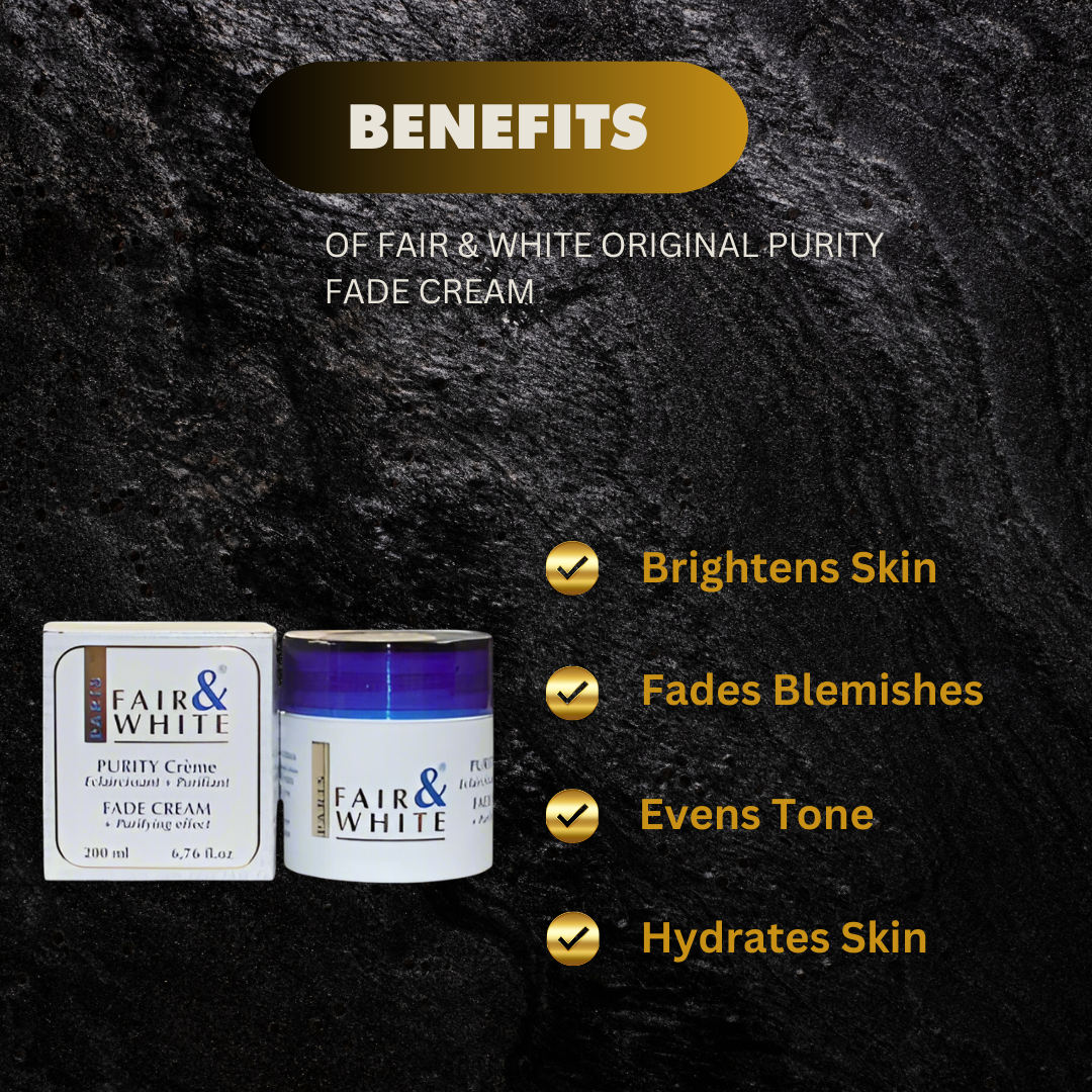 Fair & White Original Purity-Fade Cream Formulated to smooth skin as it promotes an even skin tone. Fade Cream brightens dull skin while skin discolorations. Tip: Some consumers may prefer to use a creamy textured and formula especially, during the winter season. This will help prevent flaking and irritation, keeping skin well hydrated. Directions: Apply moisturizing Fade Cream to affected areas on dry, cleansed skin, preferably at night. Gently massage into skin and let dry. Recommendation: To avoid further pigmentation, follow up with Skin Protect SPF 50 Sunscreen daily during and to maintain even skin tone. Skin type: Normal or dry skin.