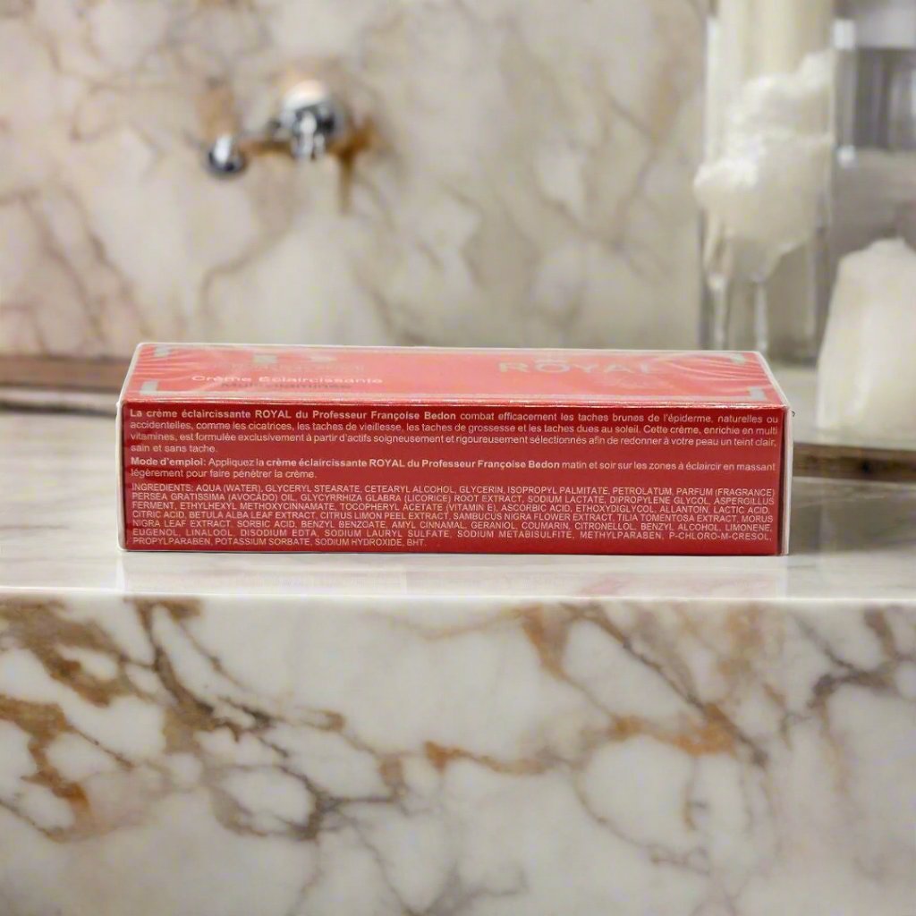 Pr. Francoise Bedon Royal Cream Multi Vitamins 50ml / 1.69 fl.oz Professor Francoise Bedon ROYAL Cream effectively fights against dark spots of the skin, nautral or accidental marks and scars caused by pregnancy, age or sun exposure. This cream enriched with multi vitamins is formulated using extracts carefully chosen to leave you a smooth and clear skin free from spots.Directions: Apply Professor Francoise Bedon ROYAL Ligthening Cream morning and evening n a reas to be treated while massaging it gently to let it penetrate the skin.