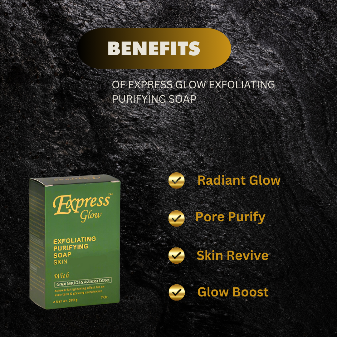 Express Glow Exfoliating Purifying Soap 7 oz Express Glow Exfoliating Purifying Soap is infused with a natural blend of Asafetida Extract and Grape Seed Oil. The formula is rich in antioxidants to provide you with a more even complexion while effectively hydrating the skin. This advanced cleansing bar is a revolutionary step towards lighter, brighter skin. Net Weight: 200g / 7 oz. How to Use: Cleanse your face and body with the Express Glow Exfoliating soap before applying any other Express Glow. Skin Type: Especially formulated for users who need advance with oily and acne prone skin. Can also be used for all skin types.
