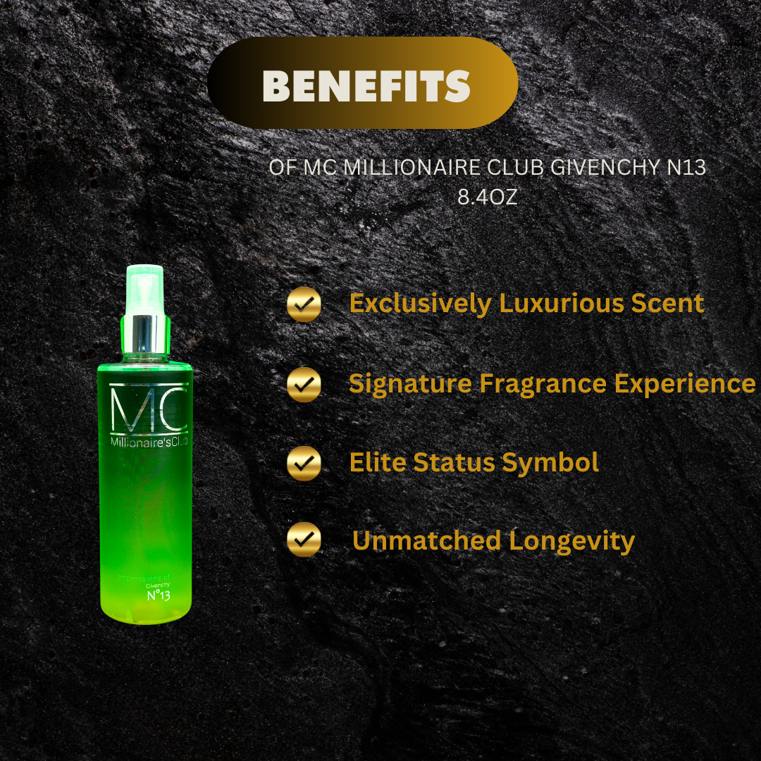 Experience luxury with Mc Millionaire Club Givenchy N13 8.4oz. This premium fragrance provides an indulgent and long-lasting scent, perfect for any occasion. With its expertly crafted blend of scents, this perfume exudes sophistication and will leave you feeling like a true millionaire. Treat yourself to the best with Mc Millionaire Club Givenchy N13 8.4oz.