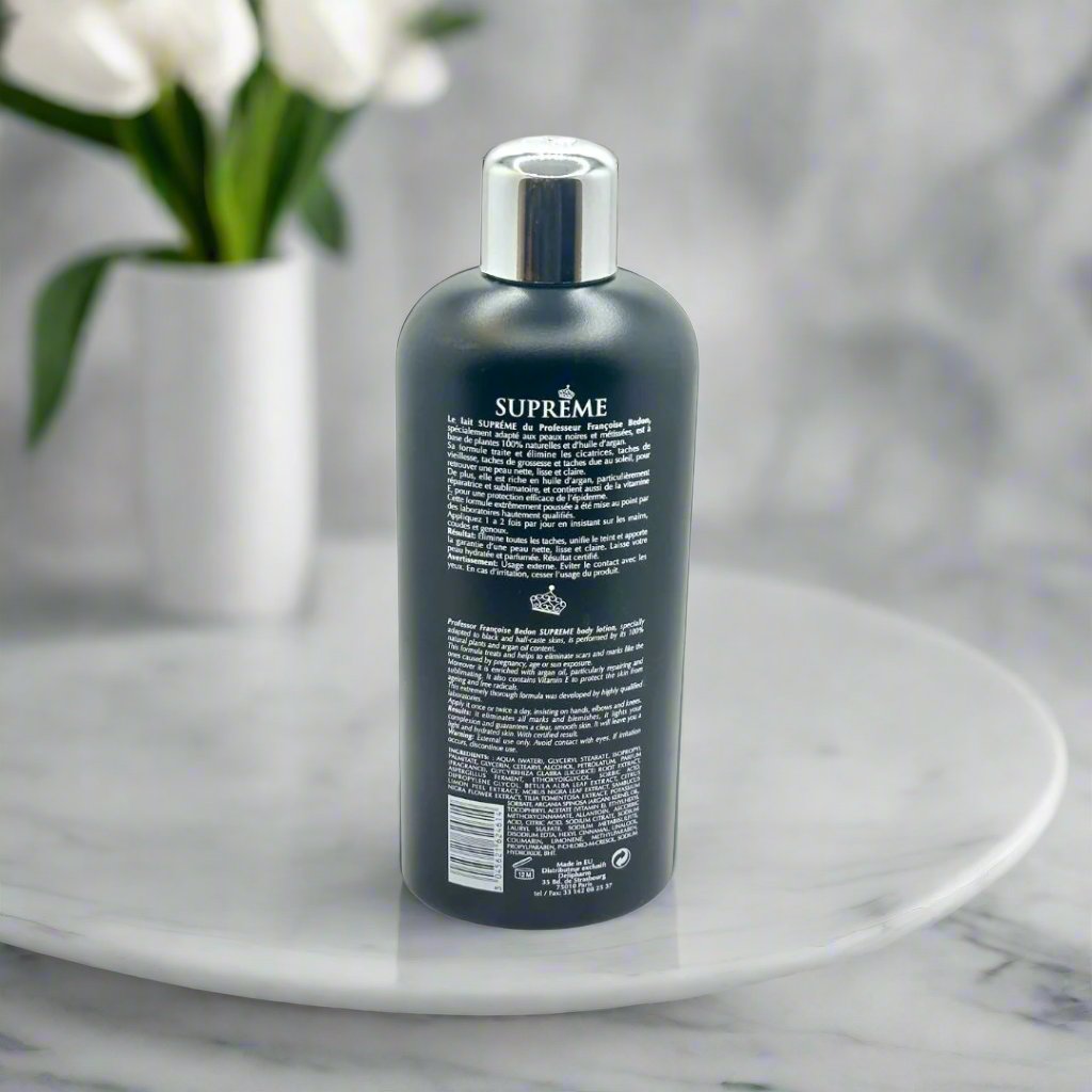 PR. Francoise Bedon Supreme Lotion 16.8 oz / 500 ml Professor Francoise Bedon SUPREME body lotion, specially adapted to black and hal-caste skins, is performed by its 100% natural plants and argan oil content. This formula treats and helps to eliminate scars and marks like the ones casued by pregnancy, age or sun exposure. Moreover it is enrished with argan oil, particularly repairing and sublimating. It also contains Vitamin E to protect the skin from ageing and free radicals. This exremely thorough formula was developed by highly qualified laboratories. Apply it once or twice a day, insisting on hands, elbows and knees. Results: It eliminates all marks and blemishes, it lights your complexion and quarantees a clear, smooth skin. It will leave your a light and hydrated skin. With certified results.