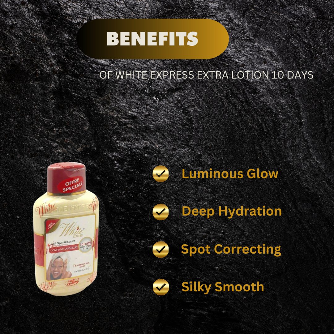 White Express Extra Lotion 17.6 oz White Express Body Milk with plants extracts takes good care of your skin every day. The Butyresorcinol complex soften and protects your body against dryness and give you lightness in 10 days.