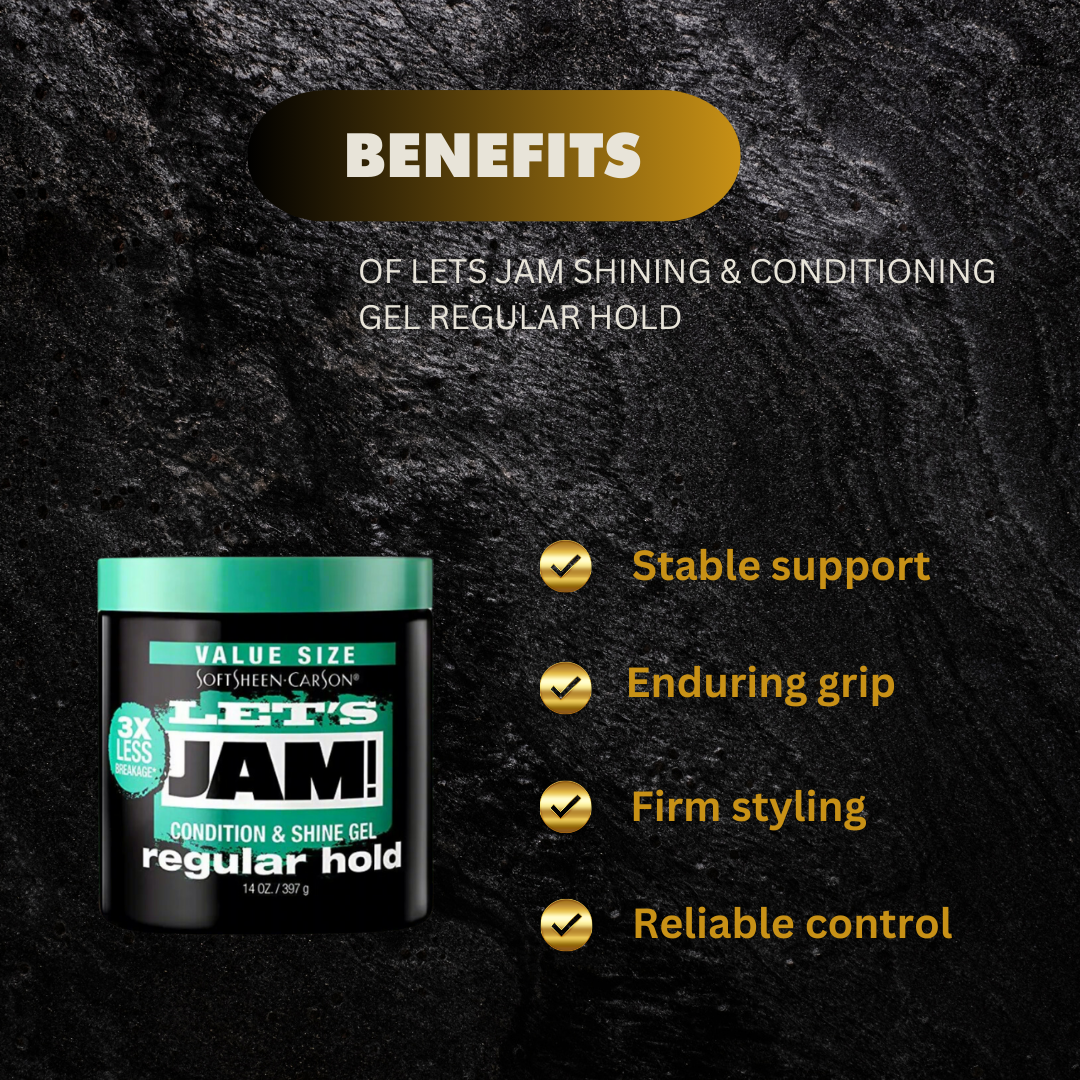 Lets Jam! Shining & Conditioning Gel Regular Hold - 14oz jar .Let's Jam Shining and Conditioning Regular Hold Gel's formula has micro-emulsion technology for great extra hold, shine and conditioning with up to 3X less breakage.
