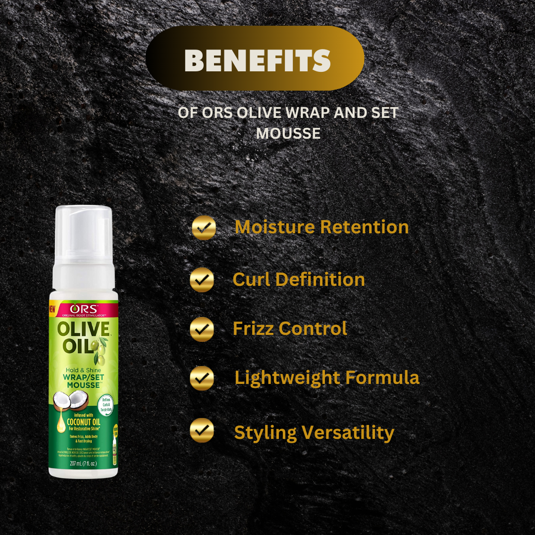 This ORS Olive Oil Wrap and Set Mousse helps you create a perfect hairstyle every time. The lightweight formula contains natural olive oil for added shine, moisture, and protection. Perfect for all hair types, this mousse provides long-lasting hold and definition. Get salon-worthy results with ORS Olive Oil Wrap and Set Mousse.