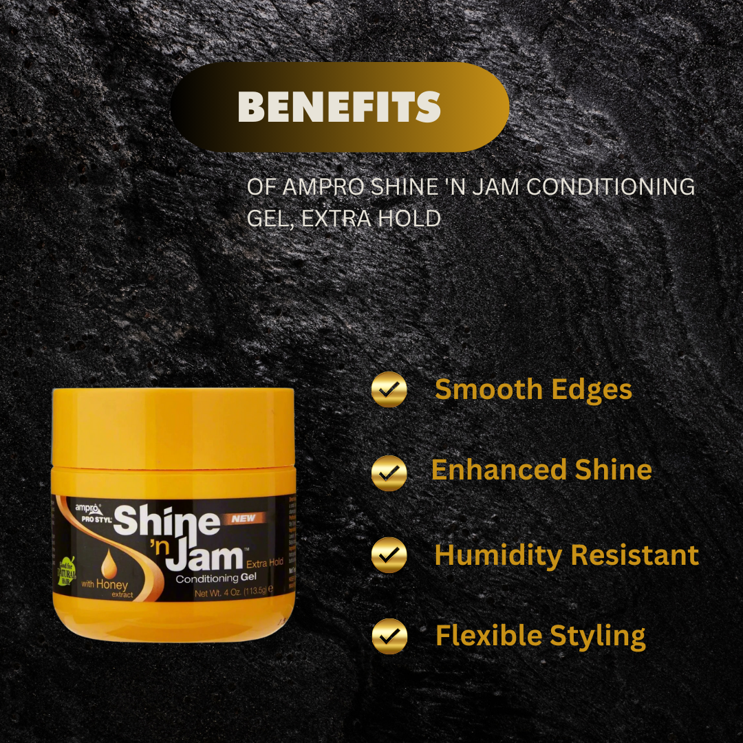 - Enjoy the long-lasting, extra strong hold and sleek look that Ampro Shine 'n Jam Conditioning Gel provides, keeping your styles in place all day.
