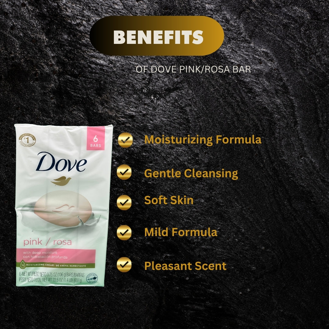 As an industry expert, trust in the Dove Pink/Rosa Bar for its pack of 6 bars, each 22.5 oz, to provide a luxurious and moisturizing experience. Made with gentle cleansers and moisturizing ingredients, this bar will leave your skin feeling soft and nourished. Perfect for daily use.
