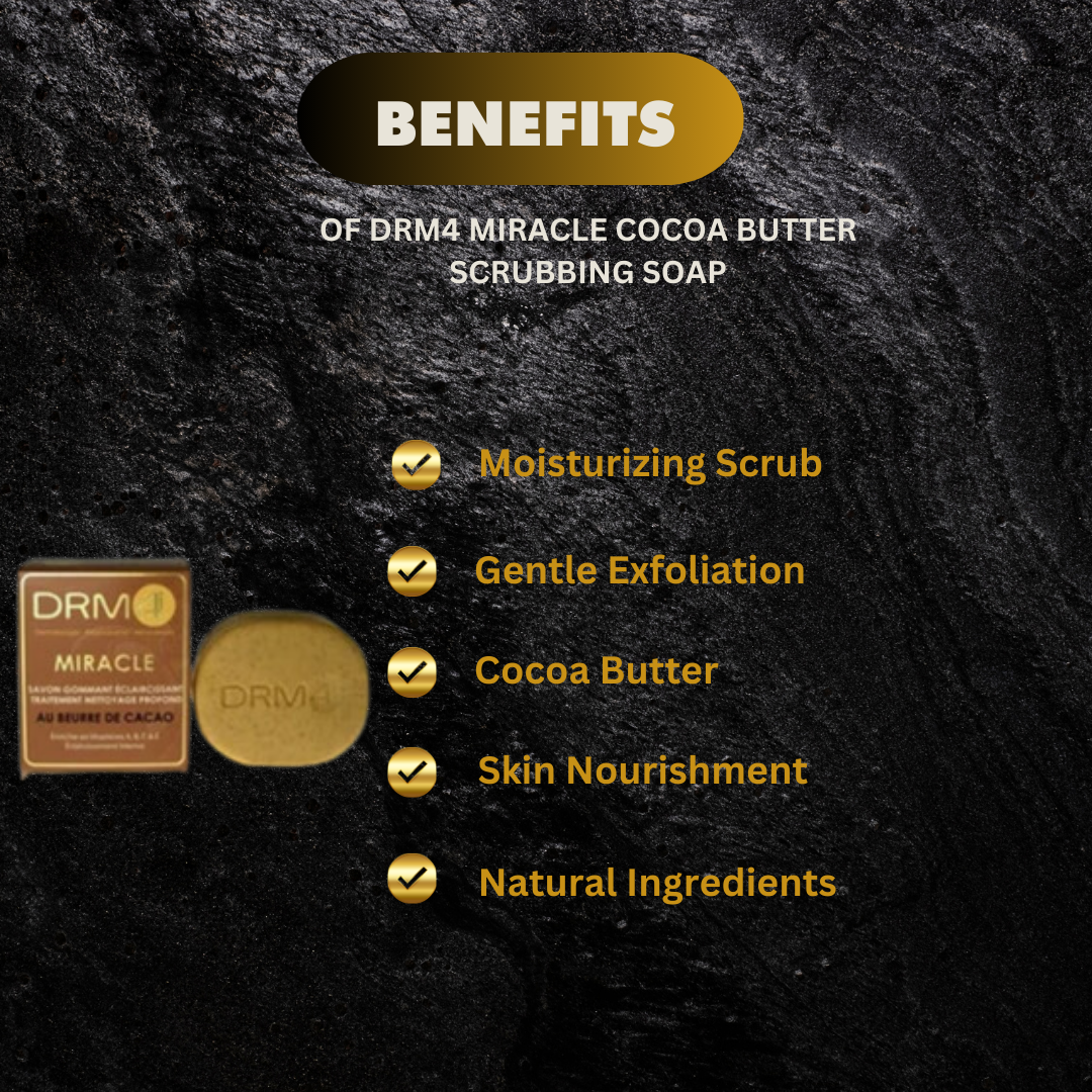 DRM4 MIRACLE Cocoa Butter Scrubbing Soap 7 oz This soap has a cocoa butter and vitamins A, B, C & E base for a double effect, cleaning and exfoliating, eliminating everything that can dull your skin and allowing for natural beautification. It's the indispensable soap that will not only allow quick and easy absorption, but also multiply efficiency when applying your skin . It eliminates impurities and dead skin cells, thins out the skin grain and soothes the skin. Helps pad the skin leaving it firmer and smoother. Instructions Use the soap everyday scrubbing for one minute to allow the active ingredients to take effect, and rinse.