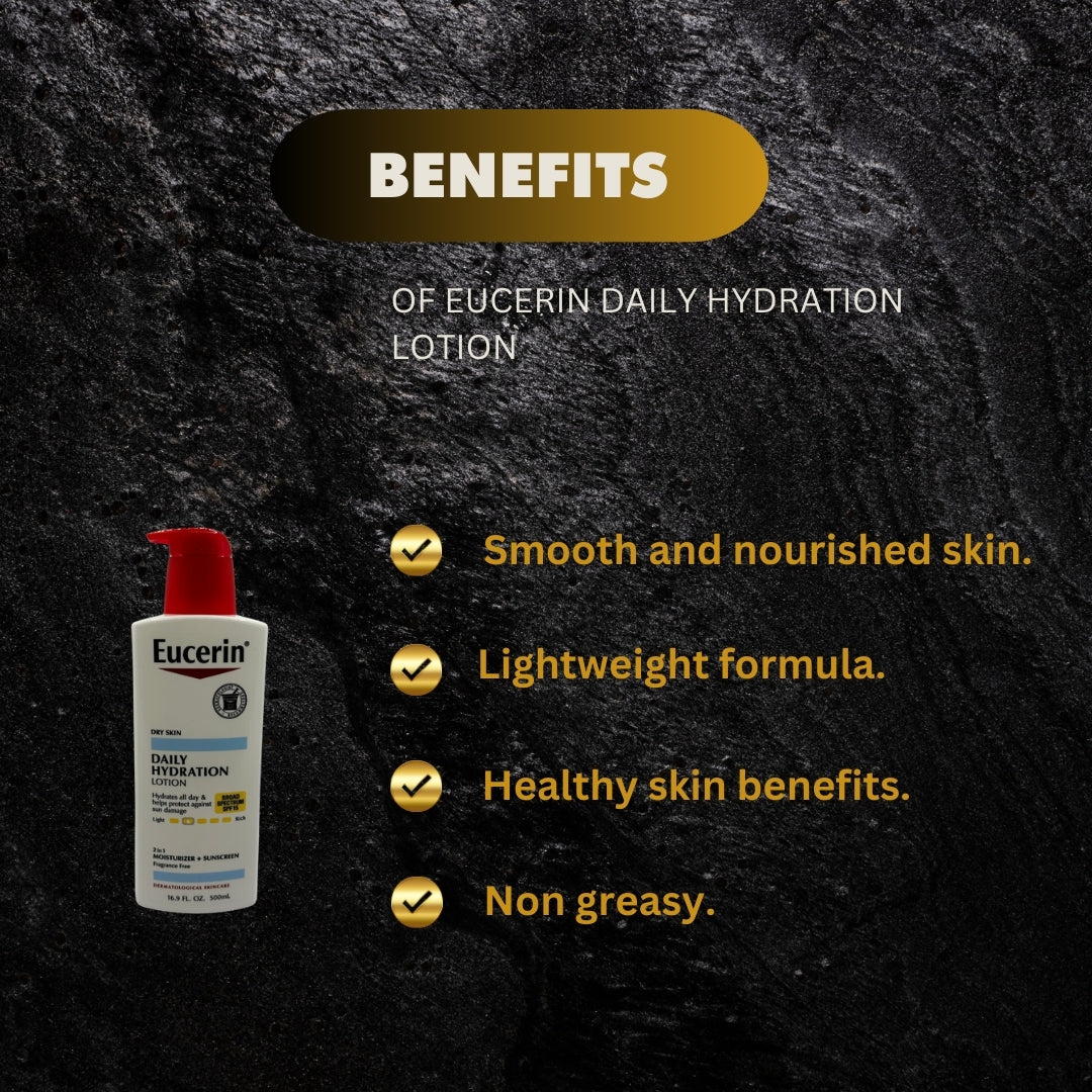 Revitalize and nourish your skin with Eucerin Daily Hydration Lotion. This lightweight formula locks in moisture for 24 hours, leaving your skin feeling hydrated and smooth. With a blend of natural ingredients, this lotion provides long-lasting hydration without feeling greasy or heavy. Experience the benefits of healthy and hydrated skin with Eucerin Daily Hydration Lotion.