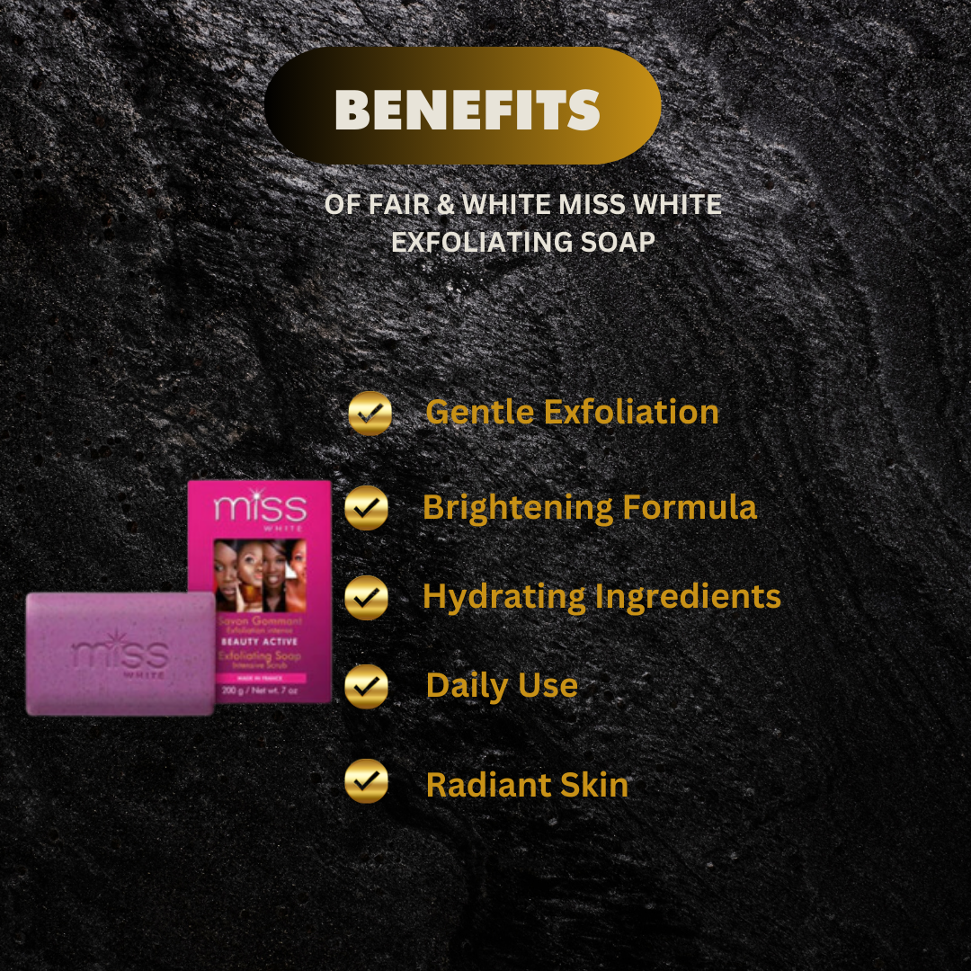 - Miss White Exfoliating Soap helps to remove dead skin cells, revealing brighter, smoother skin