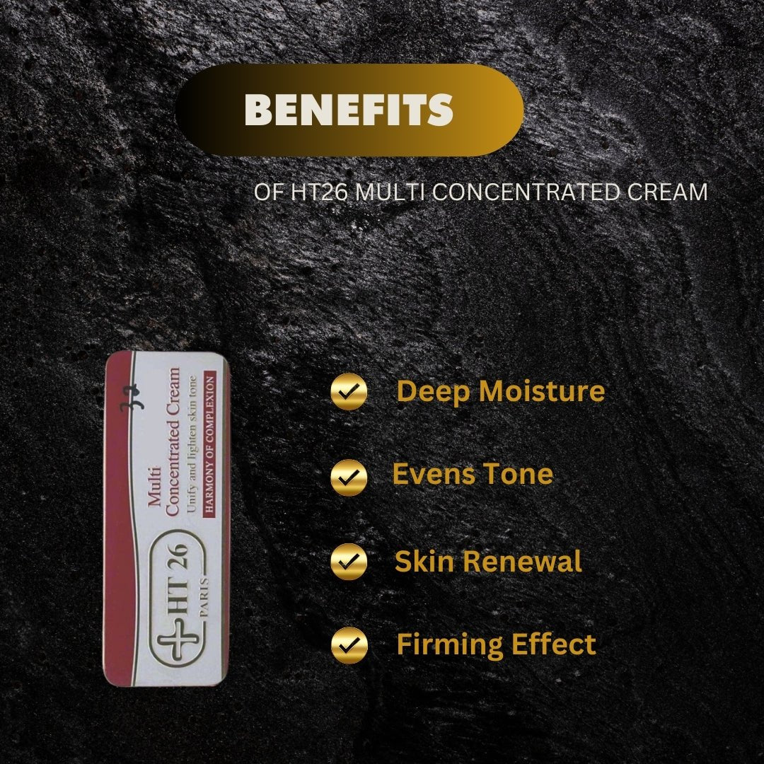 HT26 Multi Concentrated Cream is the perfect choice for anyone looking to tackle hyperpigmentation and dark spots. Its unique blend of active ingredients works to reduce the appearance of dark spots and brighten overall skin tone. Use it day and night to help restore a more even complexion and reveal brighter, healthier-looking skin. For best results, pair with HT26 Exfoliating Clearing Face Masque and the HT26 Intensive Concentrated Cream Action Taches for intense spot.