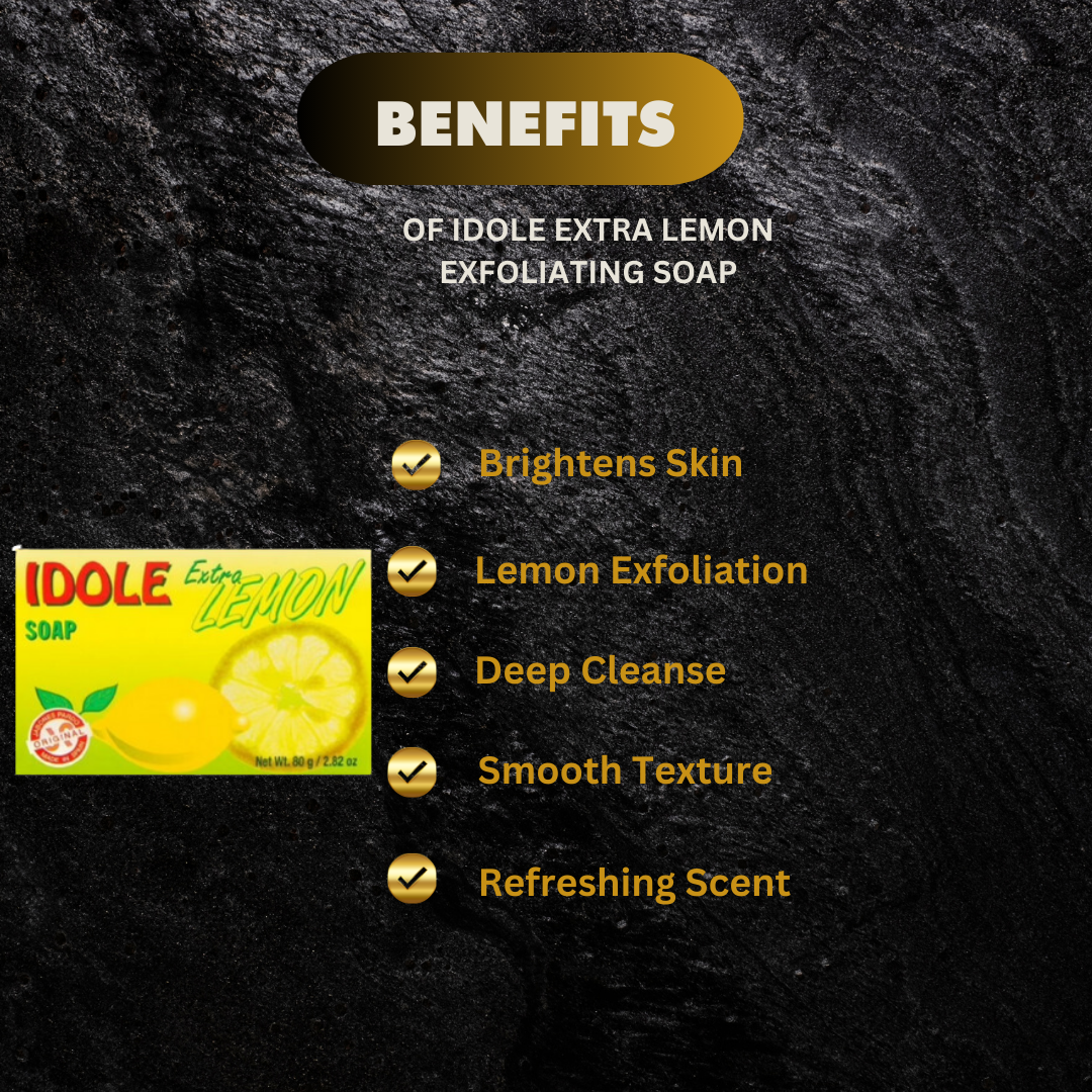 Idole Extra Lemon Exfoliating Soap 2.82 oz Idole Exfoliating Extra Lemon Soap is appropriate for personal hygiene.It cleanses the skin of impurities, leaving your skin fresh and ready to apply IDOLE Lemon cream, gel or body lotion. Directions: Use daily as a toilet soap to cleanse face, hands and body. Massage into skin and rinse well. Warnings: For external use only. Avoid contact with eyes. If contact with eyes occurs rinse with water. Keep out of the reach of children.