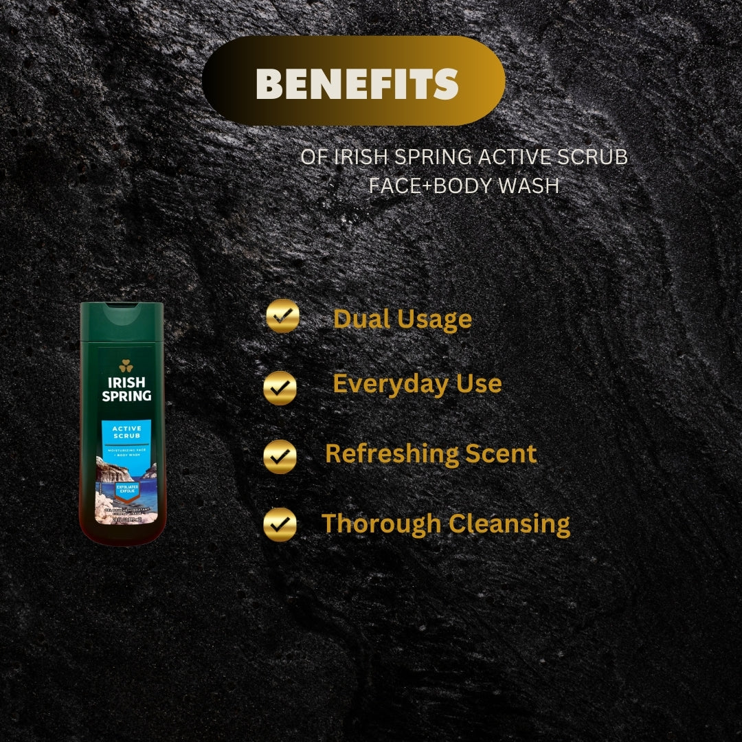 This Irish Spring Active Scrub Face+Body Wash provides a thorough and invigorating cleanse for both your face and body. With a generous 591ml bottle, it is perfect for everyday use and offers a refreshing scent that will leave you feeling clean and rejuvenated. Trust the experts at Irish Spring for a deep clean you can feel.