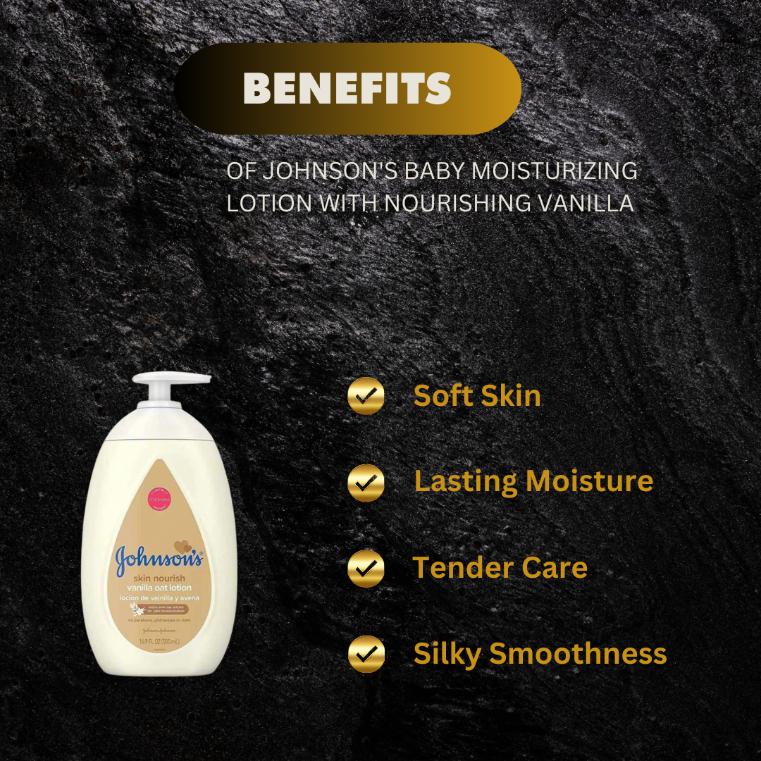 16.9-fluid ounces of Johnson's Baby nourishing baby dry skin lotion enriched with vanilla and oat extract and helps hydrate baby's skin and maintain its natural moisture balance, for smoother, healthy-looking skin Our gentle, formula is clinically proven mild and contains no harsh fragrances so you can have peace of mind when caring for your baby Designed with input from moms like you, this baby dry skin lotion is pediatrician-tested featuring a unique formula that is 100% gentle and free of dyes, parabens and phthalates Specially designed and perfectly pH-balanced for baby's delicate skin. Use our Johnson's baby lotion as part of a regular skin care routine by massaging into skin either after a bath or any time baby has dry skin