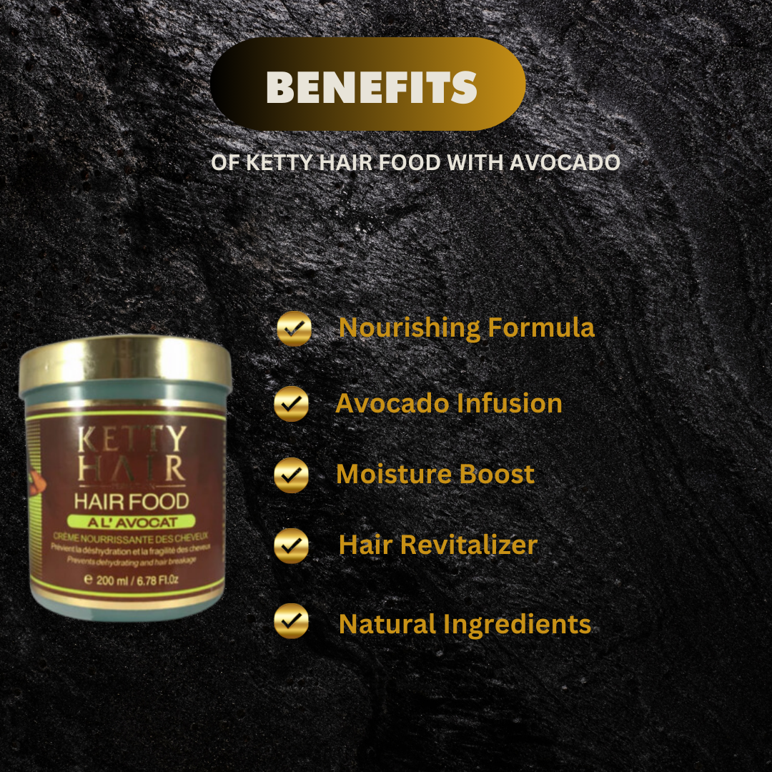 Ketty Hair Hair Food with Avocado Oil 6.78 oz. This special formula enriched with avocado oil for hair and temples. Temporary relief of falling hair and thinning, revitalized hair. Helps hair grow again. With Avocado Oil. Prevents Dehydrating & hair breakage. Promotes hair growth and reduce hair thinning.