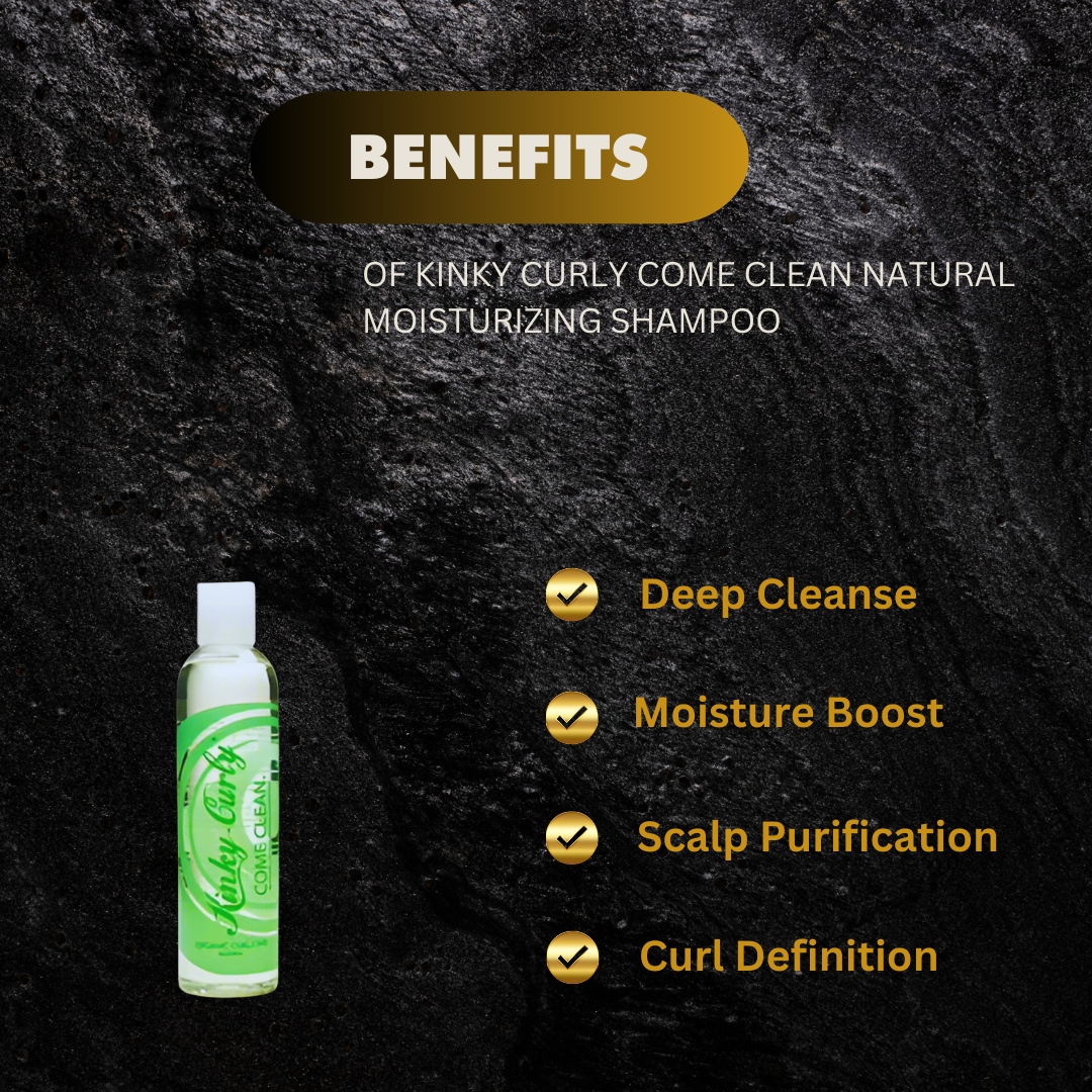 Kinky-Curly Come Clean Shampoo 8 oz. Organic Curl Care. You know all the grimy stuff you've put on your hair. Here's your chance to Come Clean. Allow this exclusive blend of organic plant and fruit extracts to gently clean your hair and scalp of dulling buildup while maintaining its proper moisture balance. Perfect enough for everyday use. Phytic Acid - a natural chealating agent that removes hard water minerals such as calcium & magnesium Corn, it wlll soften hard water, rinse cleaner and prevent hard water buildup on your hair Our exclusive blend of Mandarin Orange extract will gently clean your hair Scalp of dulling buildup while Sea Kelp will help maintain its proper moisture balance This Sulfate Free shampoo is perfect for dry damaged hair